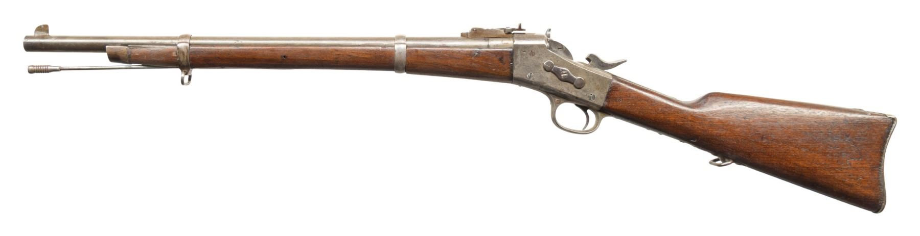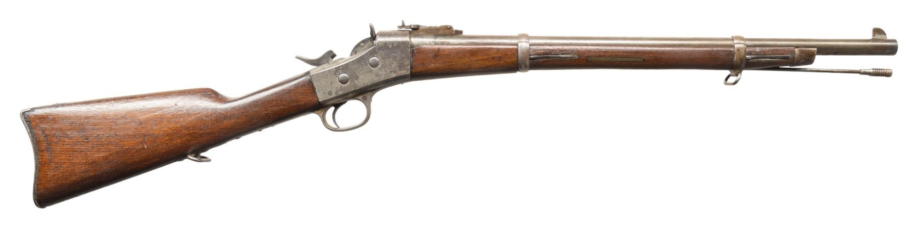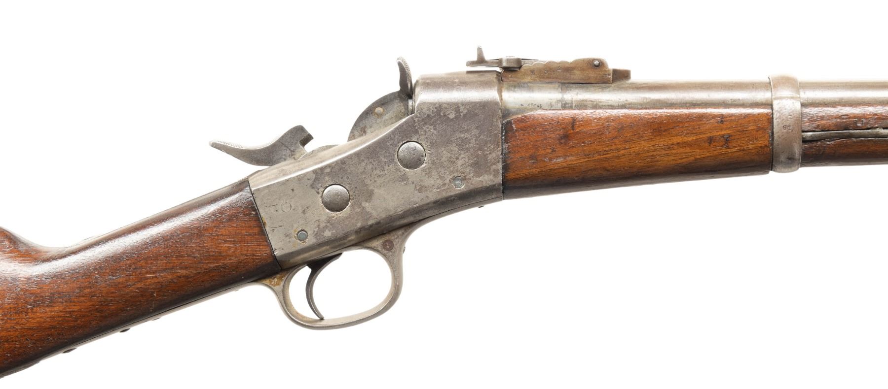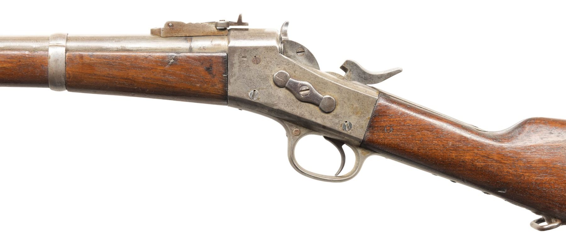 1) Converted Remington Rolling Block Rifle. Cal. 45 Colt. NSN. Bbl. 22". Crude brass blade front sight. Ladder rear sight graduated to 1000yds. Remington Rolling Block rifle converted to 45 Long Colt that should not be used with smokeless powder. Walnut stock set with bottom mounted sling swivels. Replacement ramrod present. CONDITION: stock set has old refinish with a spliced bandkeeper section on right side of forend, some chipping, a couple forend cracks, scattered dings, handling marks & finish wear. Metal has a silvery-gray cleaned appearance with scattered dings, wood finish overrun, oxidation, pitting & some frame scratches. Action functions properly when hand cycled. Good bore with strong rifling & some scattered oxidation. (01-28408/MJC).
