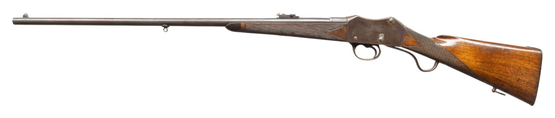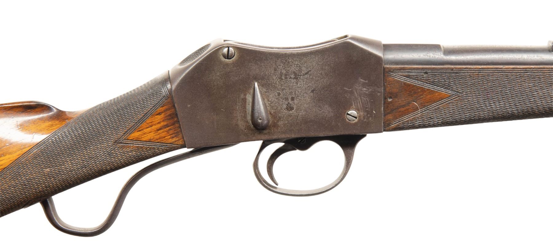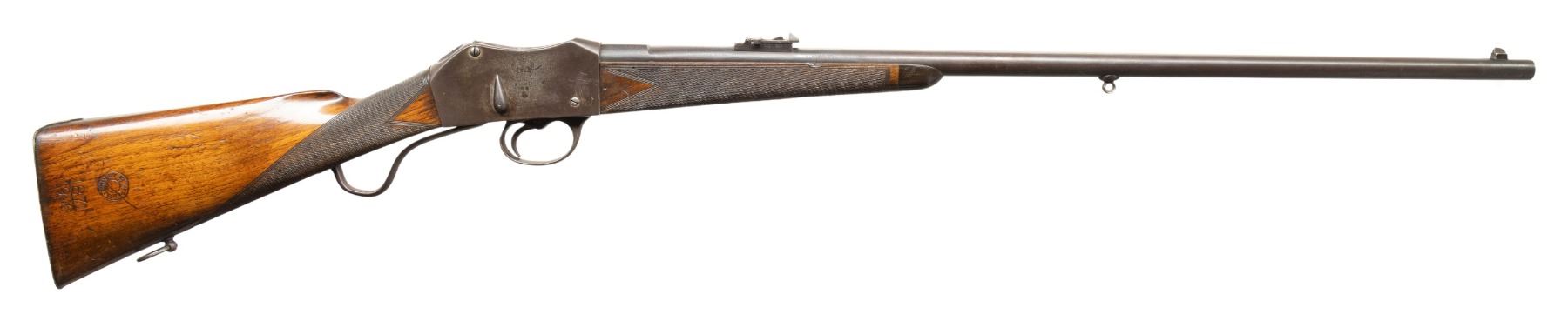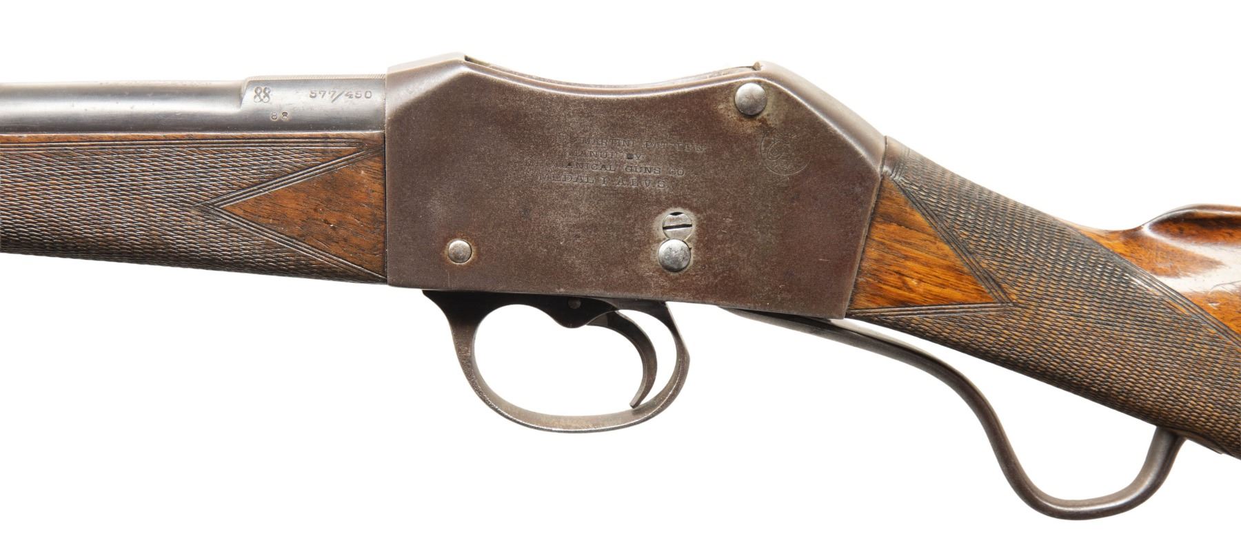 2) Peabody Martini Henry Sporting Rifle. Cal. 577/450. NSN. Bbl. 28". Blade front sight. Ladder rear sight graduated to 1000yds. Left rear of bbl. has 577/450 cal marking. Left of action has Peabody's Patent marking over "Mechanical Guns. Co" marking. Right side of action has 1885 date with crown, Insect logo, "III" & "DERIV" markings. Blued finish. Checkered walnut stock with bottom mounted sling provisions. Right side of butt has strong "IMPERIAL GUN CY" roundel & "1871/1906" marking.