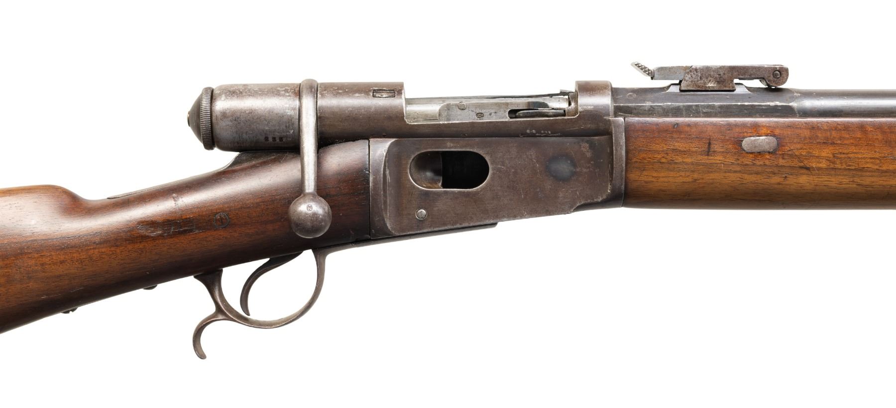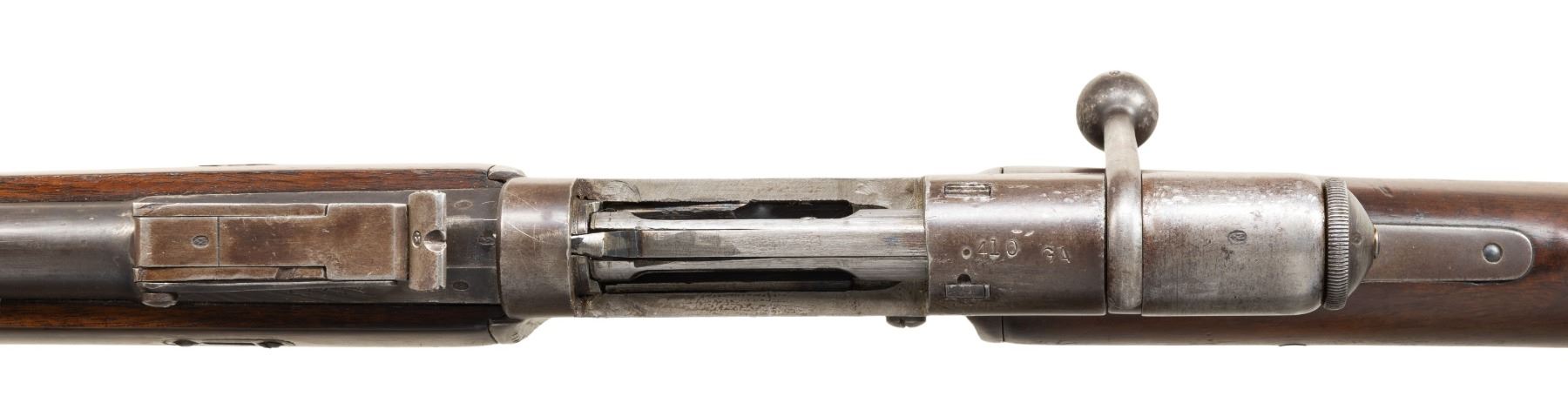 2) Swiss M81 Vetterli Shotgun Conversion Shotgun. Cal. 410. S# 217233. Bbl. 33" rifled. Blade front sight. Swiss style rear sight. Rifle has been extensively modified to single shot 410 configuration with cutdown forend, removed mag assembly, removed left & rear sections of receiver. Rear of receiver crudely marked "410 GA". Metal inventory tag present on trigger guard. Hardwood stock set with missing sling hardware. Forend is loose. CONDITION: stock set appears sanded with a 4 1/2" crack on underside of forend, further forend cracks, a few chips, scattered dings, scratches, handling marks & wear. Metal shows overall fading with notable tool marks on bbl. around rear sight, strong bluing on bbl., further scattered dings, tool marks, edge wear & oxidation. Action is functional when hand cycled. Very good bright bore with strong rifling. PROVENANCE: From the PMRB Collection. (01-28417/MJC. BOTH ANTIQUE. $400-700 for both.