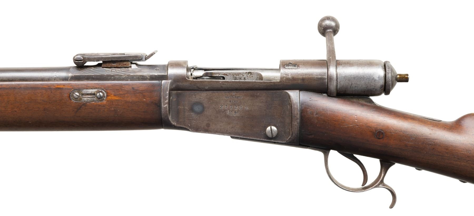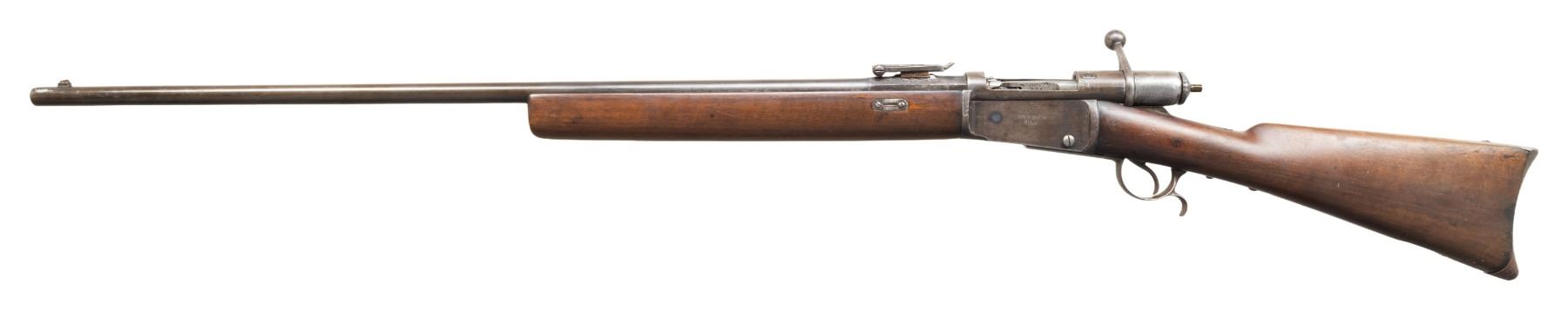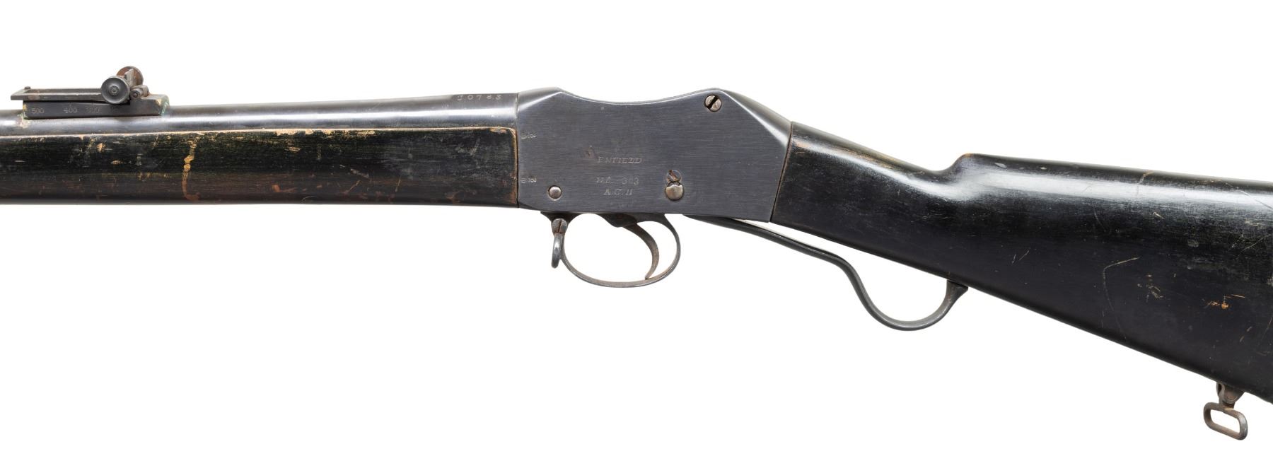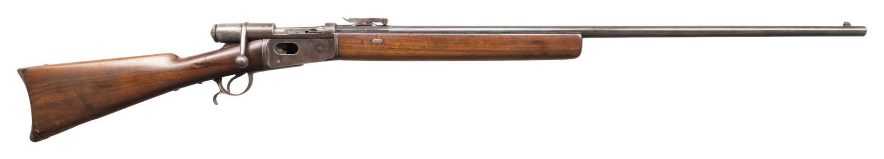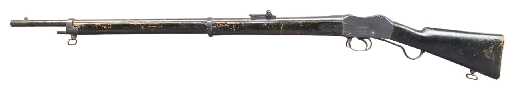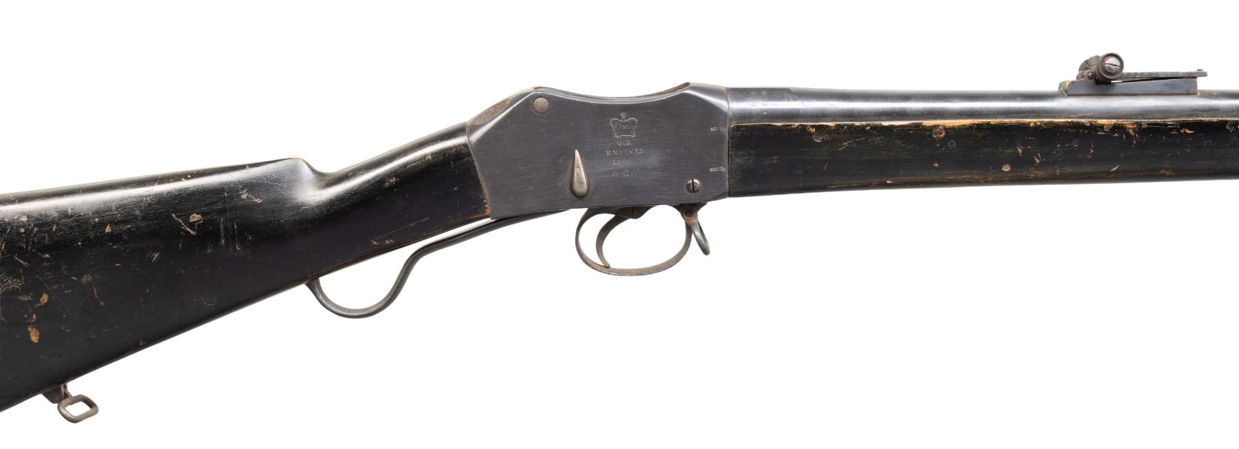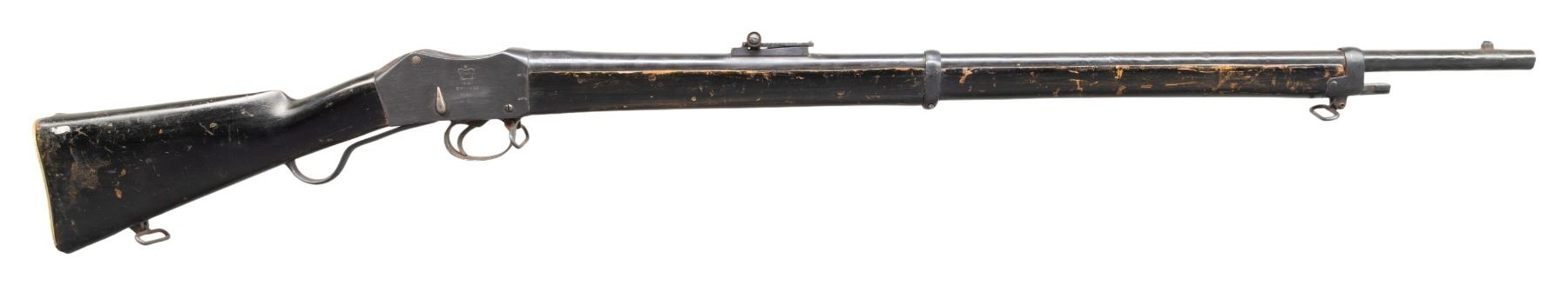 1) British Martini Henry Shotgun Conversion. Cal. 16 Ga. S# 20783. Bbl. 33" smoothbore. Blade front sight. Ladder rear sight. Action has 303 Brit markings as well as Enfield arsenal & 1888 date. Right side of bbl. has faint British sale proofs. Reblue finish. Hardwood stock set with bottom mounted sling swivels. CONDITION: stock set has older added finish with some chipping, scattered dings, finish loss, handling marks & scratches. Metal retains nearly all its reblue with scattered finished over pitting, oxidation, dings, edge wear & handling marks. Action functions properly when hand cycled. Dark poor pitted & oxidzed bore. (01-28388/MJC).