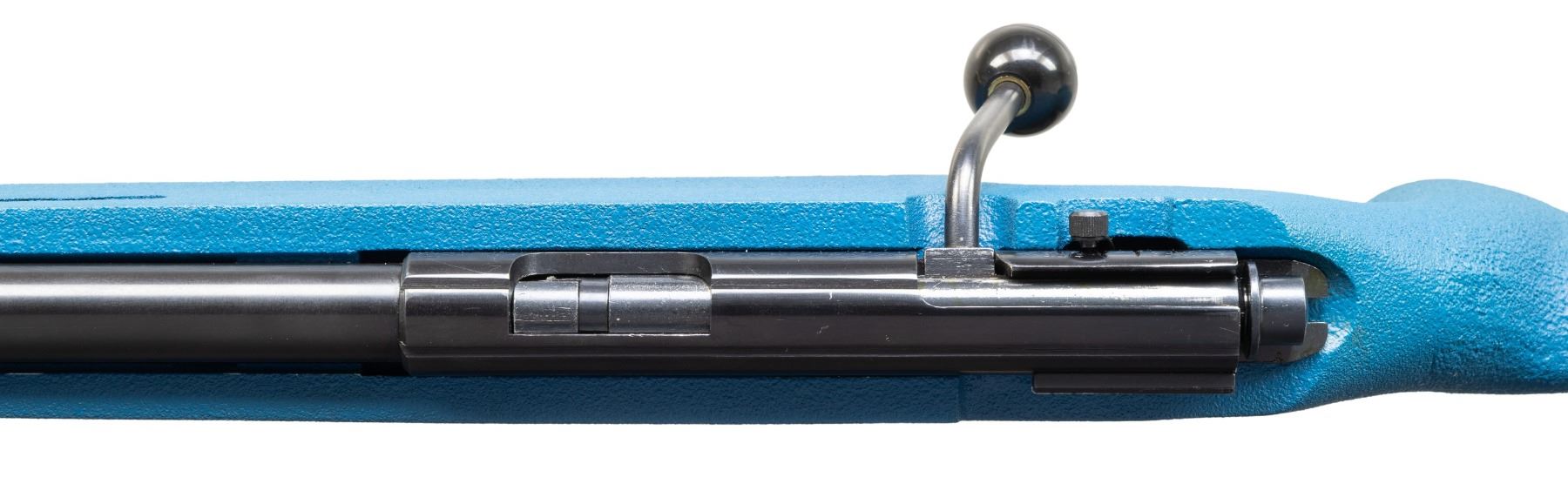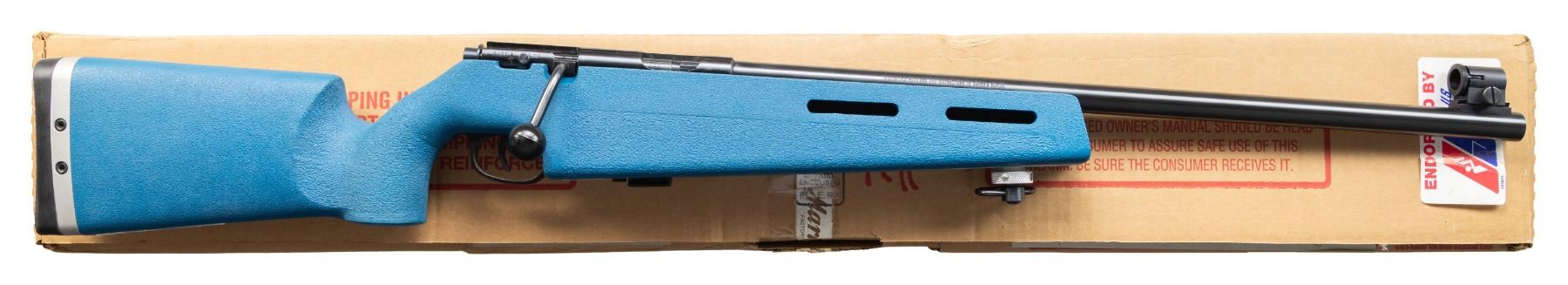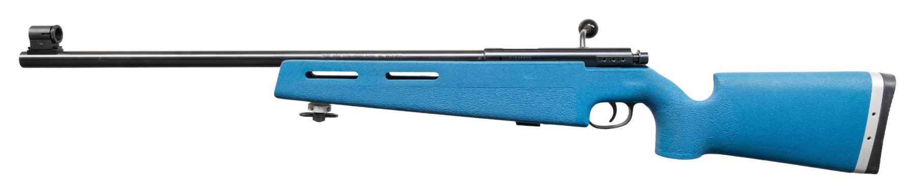 Cal. 22 LR. S# 07594909. Bbl. 22" heavy. Globe front sight. No rear iron sight installed. Receiver grooved for further sight mounting. Blued finish. Blue Kevlar tock with groove & hand stop. MAGS: 1-5 rd. UNATTACHED ACCESSORIES: matching numbered factory box with spare stock groove, manual & Williams aperture rear sight. CONDITION: stock & metal show minor handling wear. Action functions properly when hand cycled. Bright near excellent bore. (25-5247/MJC). MODERN. $400-600.