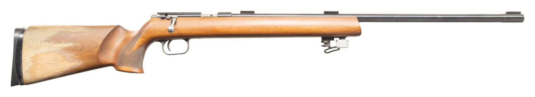 Cal. 22 LR. S# 1105026A. Free-floating 26" bbl. w/ 3 sight blocks; Ulm, West German 1976 Nitro proofs. Grooved single shot receiver. Hardwood stock w/ checkering at grip, 13" forearm accessory rail having sling point, with replacement adj. buttplate. CONDITION: very good blue. Buttstock balance has very good finish with heavy sanding around buttplate. Very good rifling. (25-6634/MD). MODERN. $300-400.