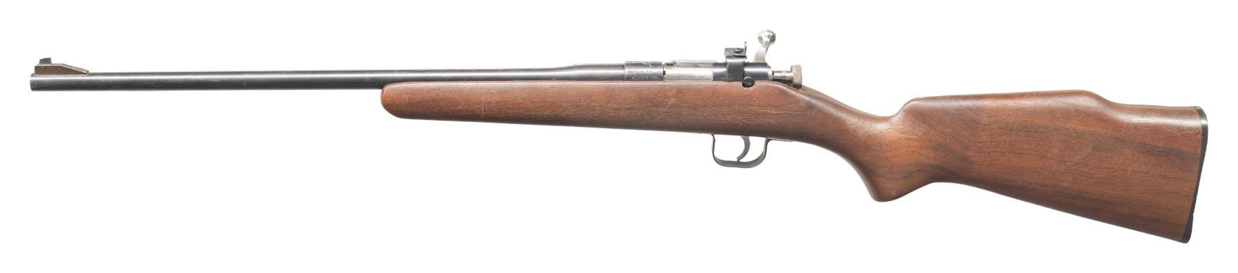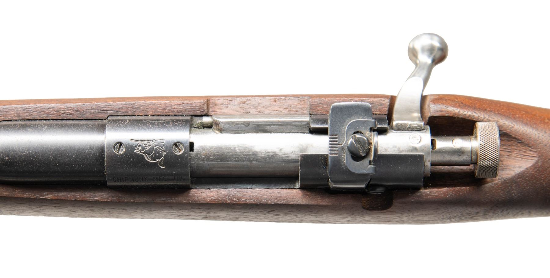 Cal. 22 S, L, LR. S# 37387. Bbl. 16 1/8". Chipmunk Rifle single shot bolt action rifle mfg. by Chipmunk Manufacturing Inc. Top of the bbl. is marked "CHIPMUNK RIFLE 22 S.L. OR L.R." above Chipmunk's patent information. Receiver is marked with a Chipmunk holding a rifle over the chamber, with "CHIPMUNK MFG. INC./ MEDFORD ORE." on the left, and the S# marked on the right.. Metal components exhibit a blue finish overall, save for on the bolt assembly, which is polished in-the-white. 1-piece plain wood pistol grip stock with grooved black synthetic buttplate. Ramped blade front sight with adj. aperture rear sight. CONDITION: metal components retain the majority of their original factory blue finish, exhibiting an area of wear and thinning on the right side of the bbl. from previously cleaned oxidation, with scattered spots of light surface oxidation present overall. Bright bore, exhibiting some patches of light pitting, while retaining well defined rifling throughout. Proper manual mechanics (bolt must be retracted to extract, with the cocking piece having to be cocked manually after closing the bolt). Stock shows some minor scratches and superficial handling marks, but otherwise remains sound. PROVENANCE: Estate of Groves Herrick. (25-6150/MLW). MODERN. $200-300.