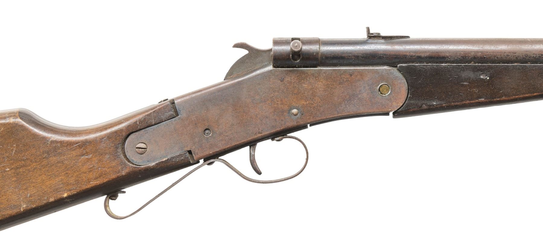 Cal. 22 RF. NSN. Bbl. 15". Blade front sight. Fixed rear sight. Per Section III of the ATF's C&R list the Hamilton No. 27 is removed from the provisions of the NFA. Hardwood stock set. CONDITION: stock set has a dark appearance with some small cracks, chips, finish loss, dings & handling marks. Metal has a dark gray appearance with overall oxidation, scattered edge wear, traces of bluing & handling marks. Action functions properly when hand cycled. Dark worn & pitted bore. PROVENANCE: Estate of Groves Herrick. (25-5729/MJC). CURIO. $50-75.