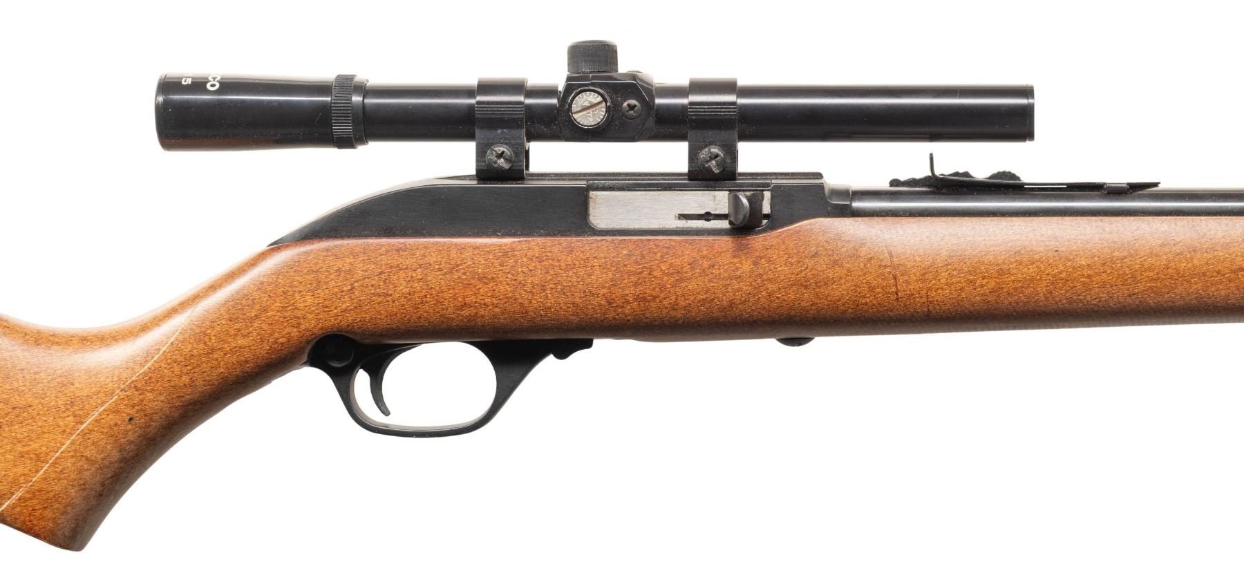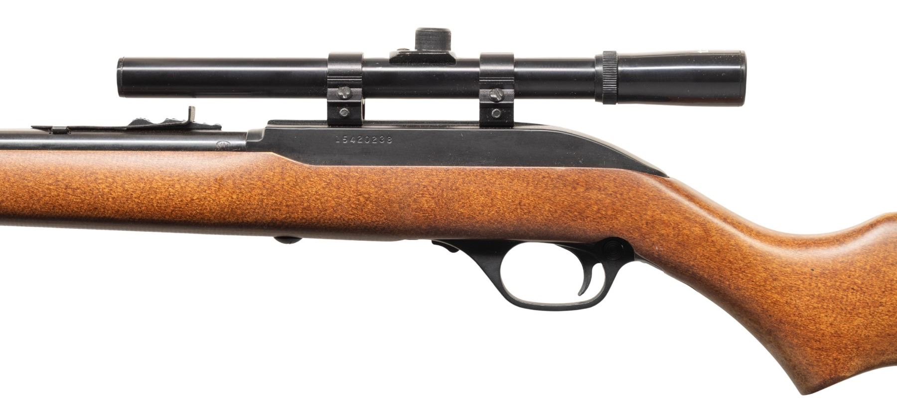 Cal. 22 LR. S# 15420238. Mfg. 1985. Bbl. 22" w/ sporting sights. Missing tubular mag. Tasco 4x15 scope. Hardwood stock. CONDITION: very good blue. Very good wood finish with large scratch & sticker residue. Very good rifling. PROVENANCE: Paul Birkenstamm Collection. (25-6309/MD). MODERN. $150-250.