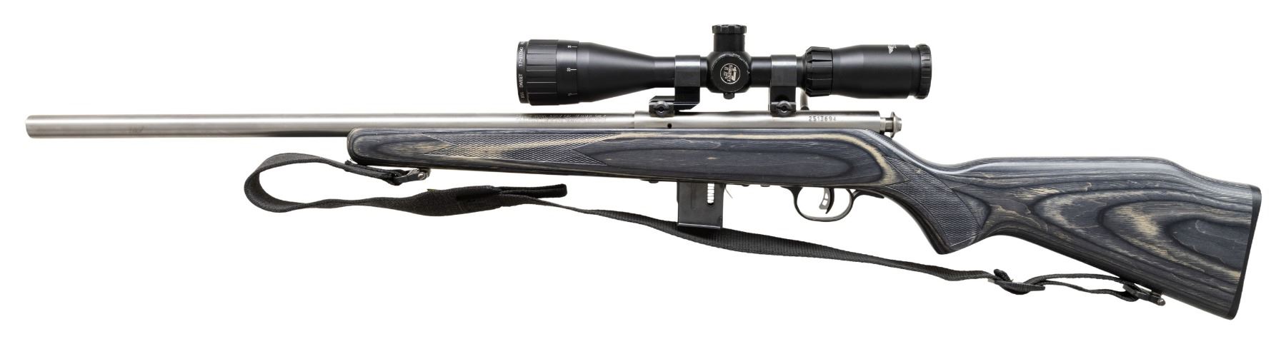 Cal. 17 HMR. S# 2513694. Bbl. 21" heavy stainless. Rifle is sighted with a BSA Sweet 17 3-12x power scope. Scope has duple crosshair reticle & good optics. Stainless finish. Adjustable trigger. Laminated stock set with bottom mounted sling swivels & black nylon sling. MAGS: 1-10 rd. that shows a couple spots of light oxidation. UNATTACHED ACCESSORIES: matching numbered factory box with manual & trigger lock. CONDITION: metal & stock show a few light handling marks. Action functions properly when hand cycled. Bright near excellent bore. (25-4849/MJC). MODERN. $300-500.