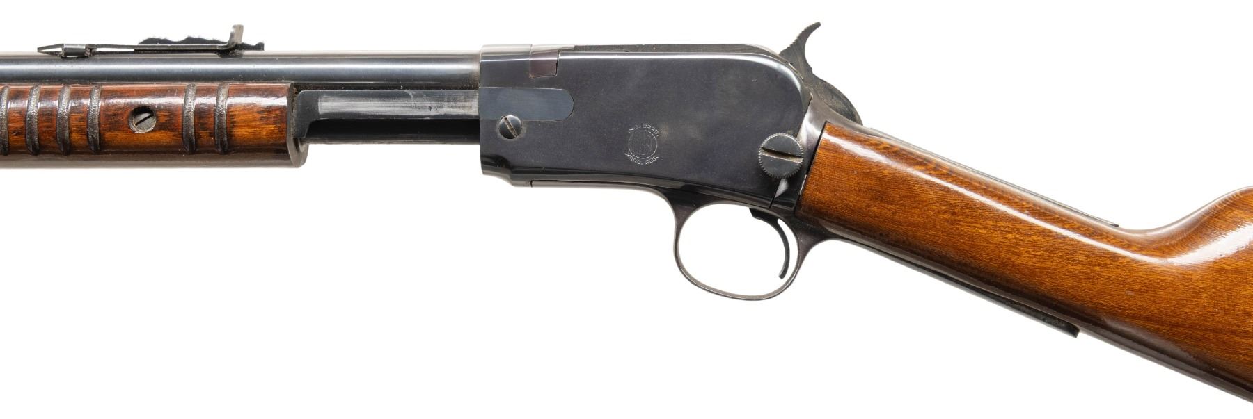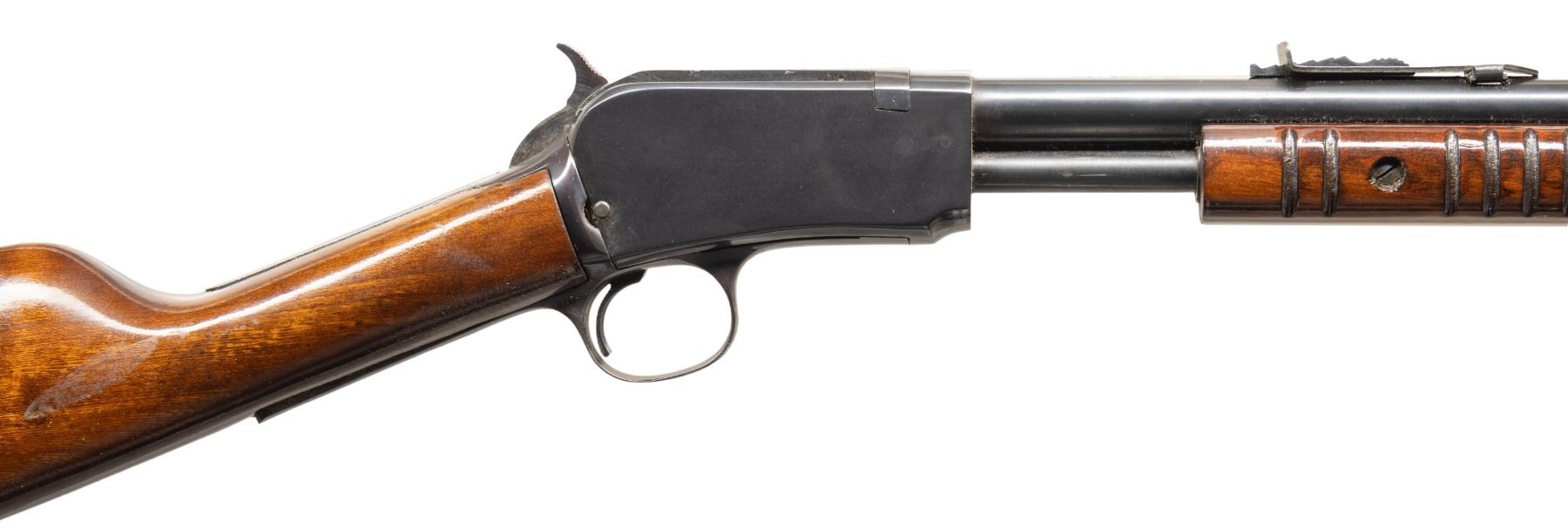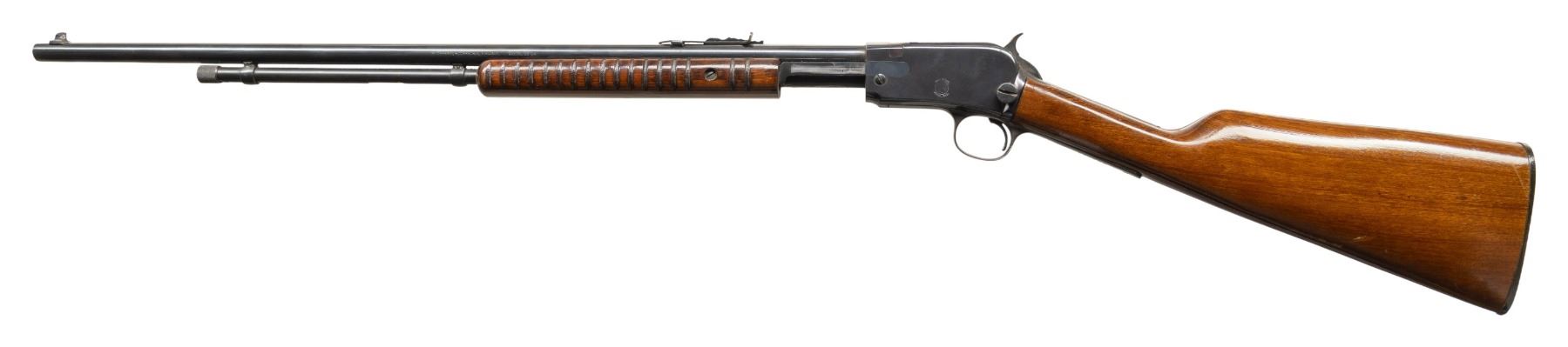 1) ROSSI 62 SA PUMP ACTION. Cal. 22 S, L, LR. S# G123530. Bbl. 23". Blade front sight & elevator rear sight. Tubular mag. Hardwood stock set. CONDITION: good blue with cycling wear & marks. Tang screw is missing. Good wood finish with marks. Very good rifling. (25-5876/MD)
