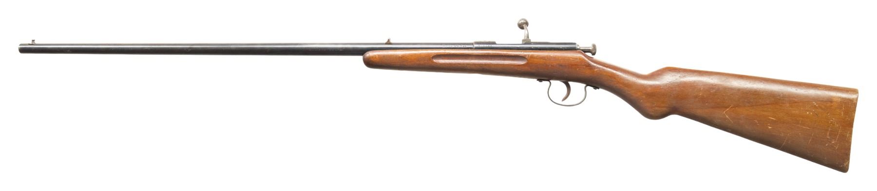 1) BELGIAN SINGLE SHOT BREECHLOADING CADET STYLE MUSKET WITH BAYONET. Cal. 8mm Rimfire. S# 3893. Bbl. 28". Cadet style single shot breechloading musket produced by an unknown mfg. in Belgium. Left side of the receiver / bbl. is marked with the S# "3893" above assorted Belgian commercial proofs and "FL.8m.1.L". 3-band fastened musket pattern 1-piece straight grip stock with flat iron buttplate and iron ramrod. Lower buttplate screw has broken on one half of the head. Toeline of stock and underside of center bbl. band feature sling swivels. Fixed musket pattern blade front sight with empty rear sight dovetail. UNATTACHED ACCESSORIES: triangular socket bayonet marked "3900" on the top flat. Bayonet is complete with its leather scabbard featuring a belt swivel and brass pointed drag. CONDITION: metal components retain trace to fair amounts of their original blue finish, exhibiting wear fading to gray and brown patinas, as well as light to mild surface oxidation overall. Bright bore, exhibiting scattered spots of light to mild pitting, while retaining good rifling throughout. Proper manual mechanics. Stock shows scattered marks and impressions from handling and storage, with 2 small cracks and a small chip present on the wrist stemming from the receiver tang. Bayonet has been partially cleaned at one time, exhibiting a gray patina, with scattered spots/patches of light to mild surface oxidation and pitting present overall. Leather scabbard has dried and stiffened, exhibiting moderate age related cracking and losses to its exterior, with stitching no longer remaining present. (25-5874/MLW). 2) JGA KARABINER SINGLE SHOT BOLT ACTION RIFLE. Cal. 6mm Flob. S# 431794. Bbl. 23 5/8". Karabiner single shot bolt action rifle mfg. in Germany by JGA. Top of the bbl. is marked "ORIGINAL J.G.A. KARABINER", with German proofs and the cal. designation marked on the left. Top of the receiver is marked with the encircled "J/ G/ A" logo, with the S# marked on the left. Metal components exhibit a blue finish overall, save for on the bolt assembly, which is polished in-the-white. 1-piece plain wood pistol grip buttstock with grasping grooves. Dovetailed blade front sight and U-notch rear sight. CONDITION: metal components retain the majority of their original factory blue finish, exhibiting areas of wear and thinning fading to gray and brown patinas, as well as some scattered spots and patches of light to mild pitting. Mirror bore, exhibiting a couple of small scattered spots of light pitting, while retaining strong rifling throughout. Proper manual mechanics. Stock shows scattered marks and impressions from handling and storage, but otherwise remains sound. PROVENANCE: From the PMRB Collection. (25-5879/MLW). BOTH CURIO. $400-650.