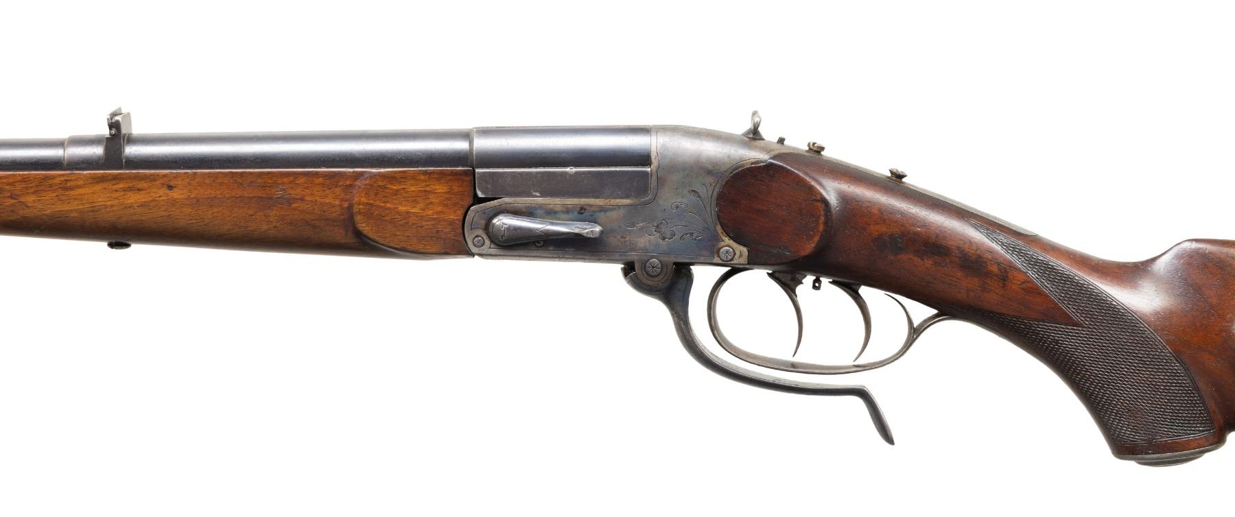 SHOT RIFLE. Cal. 32 Win (32-20). S# 210419. Bbl. 25.5". Blade front sight & 2 leaf rear sight. Underlever Tell action w/ dbl. set triggers, wing safety, cocking indicator & 2 screws for tang sight. Walnut stock set w/ schnabel forearm tip, Bavarian left side cheekpiece, checkered pistol grip, steel grip cap & horn buttplate. CONDITION: fair barrel blue mixed with peppery oxidation & scattered marks. Faded case colors on receiver with peppery oxidation & worn finish in carrying areas. Forearm lightly sanded & refinished showing a repaired crack on left side. Buttstock has worn wood finish with numerous light dings. Fair worn rifling. PROVENANCE: Estate of Groves Herrick. (25-5670/MD). CURIO. $500-800.