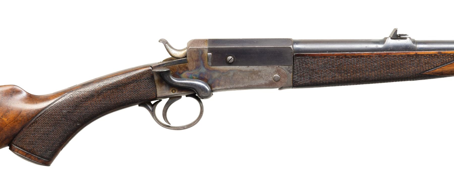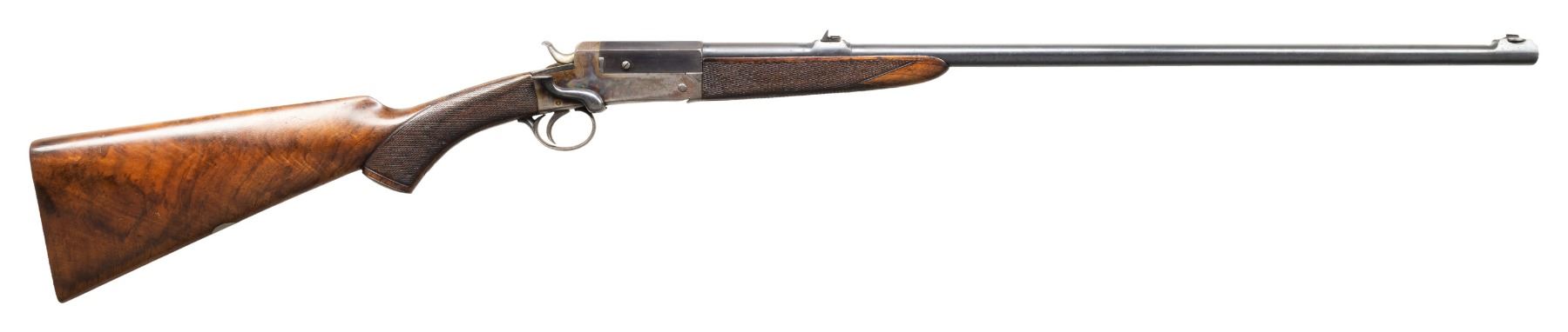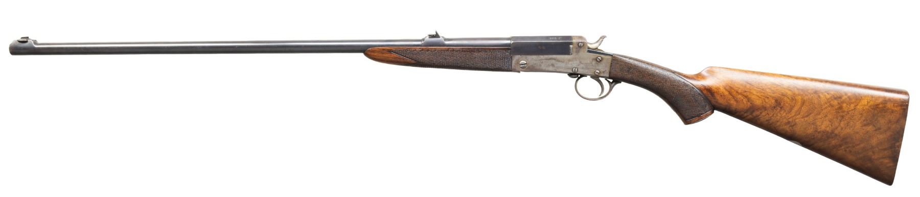 WEBLEY PATTERN ROOK RIFLE. Cal. 255 Jeffrey. S# 9885 (assembly # 83956). Rnd. 26"; has been relined & reproofed . Blade front sight & 3 leaf rear sight. Boxlock action w/ side lever & extractor. Replacement checkered walnut stock set w/ grooved butt & German silver toeline nameplate. CONDITION: good barrel blue showing large areas of fading finish mixing with gray patina showing scattered peppery oxidation & scratches. Right side of action has good case colors with balance fair fading colors mixing with brown patina, peppery oxidation & scratches. Lightly sanded & refinished wood shows scattered light dings. Shallow rifling shows pitting. PROVENANCE: Estate of Groves Herrick. (25-5717/MD). CURIO. $500-800.