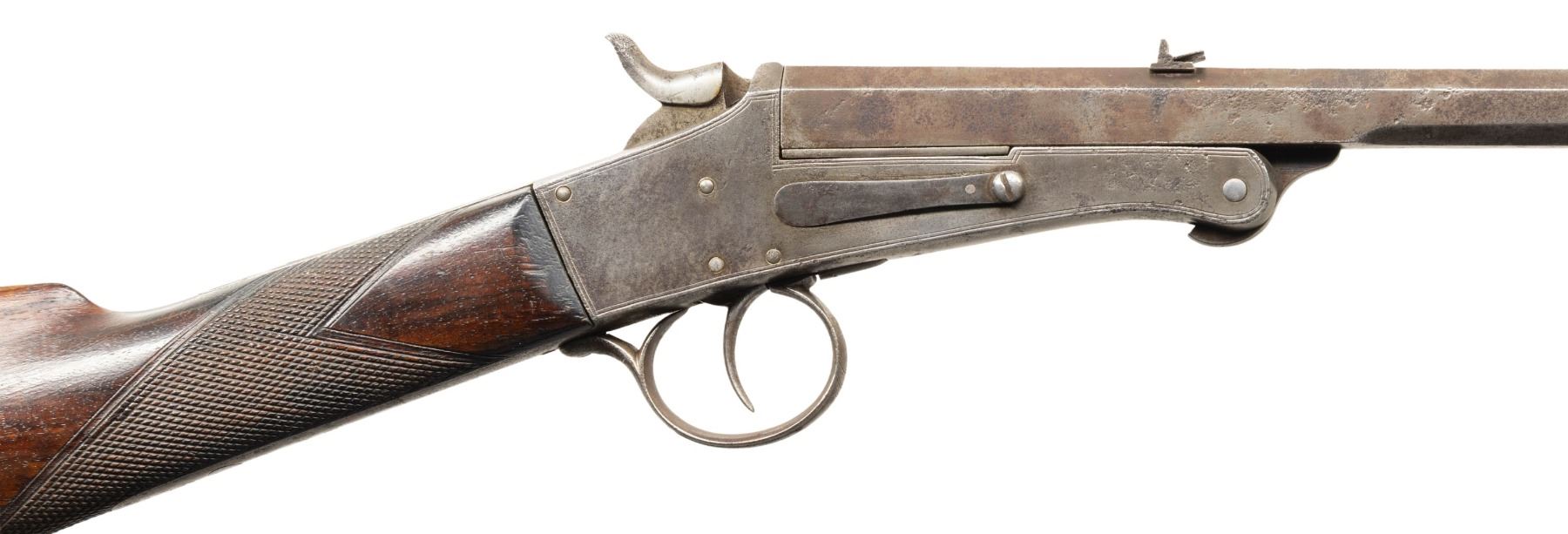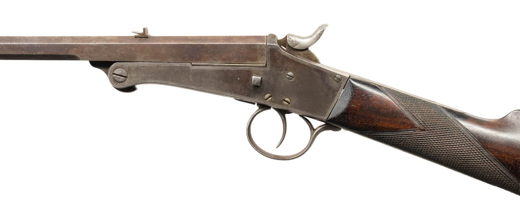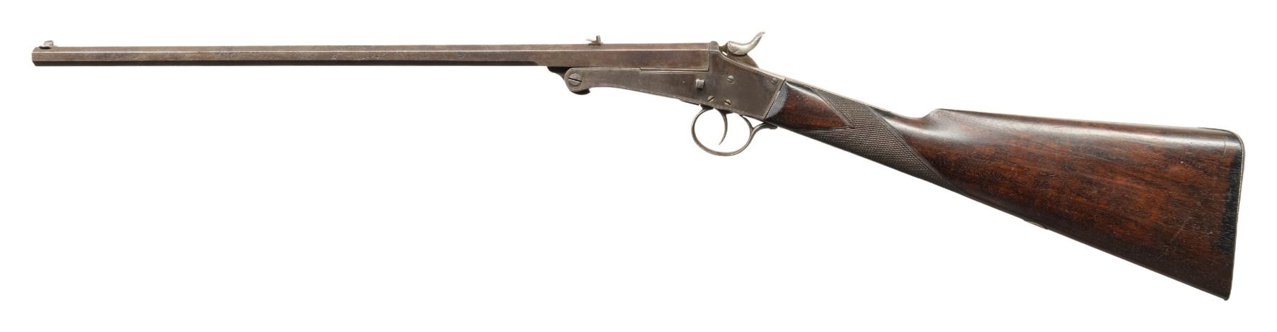 Cal. 32 RF. NSN. Oct. 21" bbl. w/ Birmingham black powder proofs for "16" bore. Blade front sight & 2 leaf rear sight. Tranter style action w/ side button opening. Checkered straight grip walnut stock w/ iron buttplate & German silver oval toeline name plate. CONDITION: metal has cleaned gray patina appearance with pitting throughout. Wood has good appearing finish with light dings & shrinking fit to metal. Bore shows pitting throughout. PROVENANCE: Estate of Groves Herrick. (01-28890/MD). ANTIQUE. $300-500.