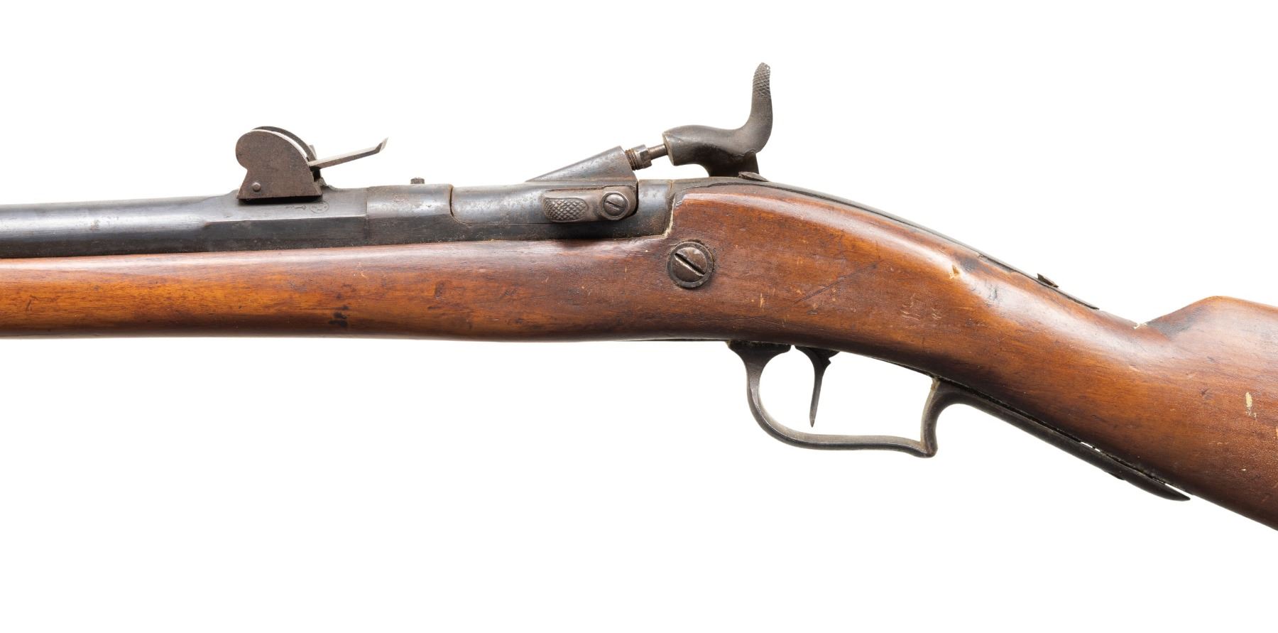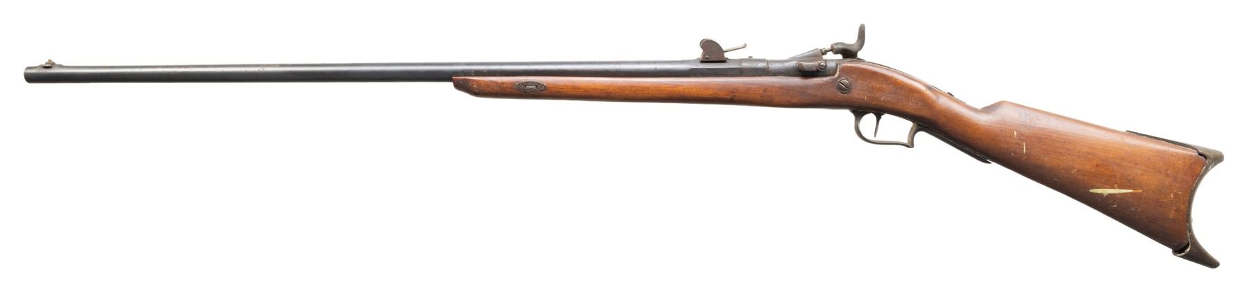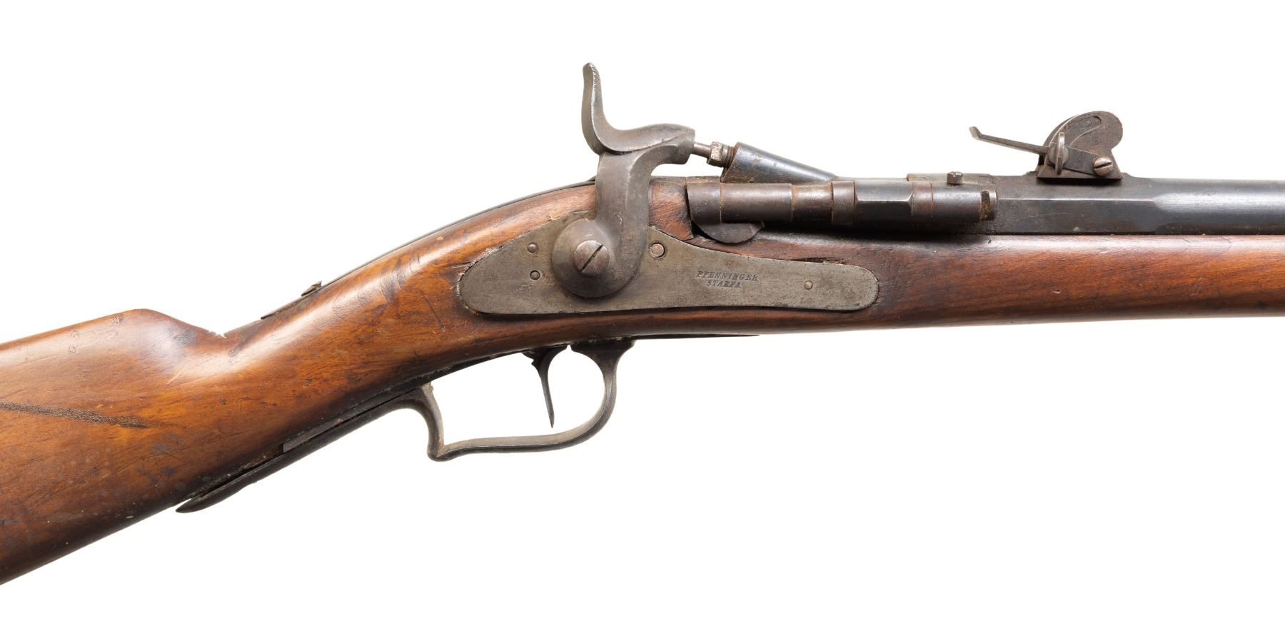CONVERTED TO PERCUSSION. Cal. 11.8mm. NSN. Rnd. 30.5" bbl.; has black powder Belgian proofs. Blade front sight & tangent adj. rear sight. Snider style action w/ "7" on breech block; breech block converted to percussion with firing pin replaced with percussion nipple. Lock marked "PFENNINGER / STAFFA". Wedge fastened hardwood stock w/ replacement oversized Schuetzen buttplate. CONDITION: metal has good fading blue with oxidation & marks. Fair worn wood finish with cracks, white paint & marks. Bore shows pitting & strong rifling. Mechanically fine lock. PROVENANCE: Estate of Groves Herrick. (01-28326/MD). ANTIQUE. $300-500.