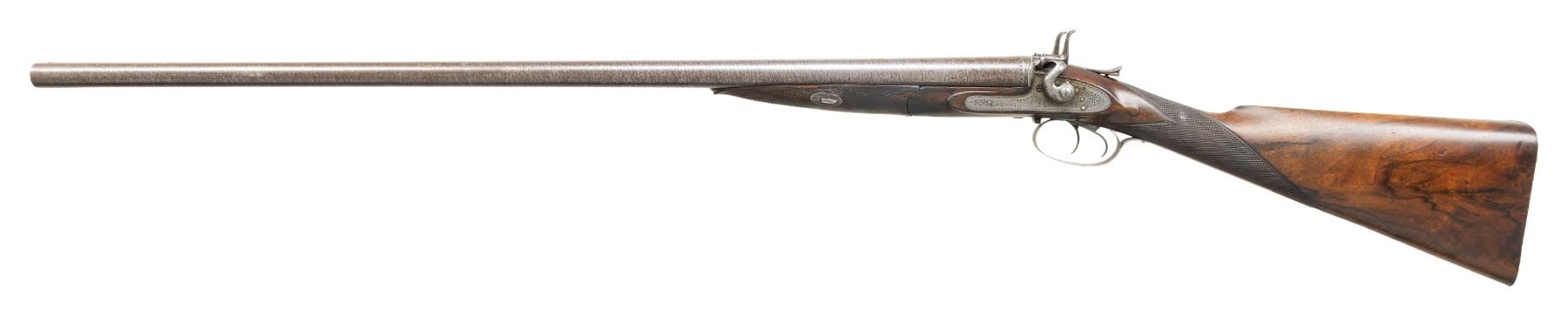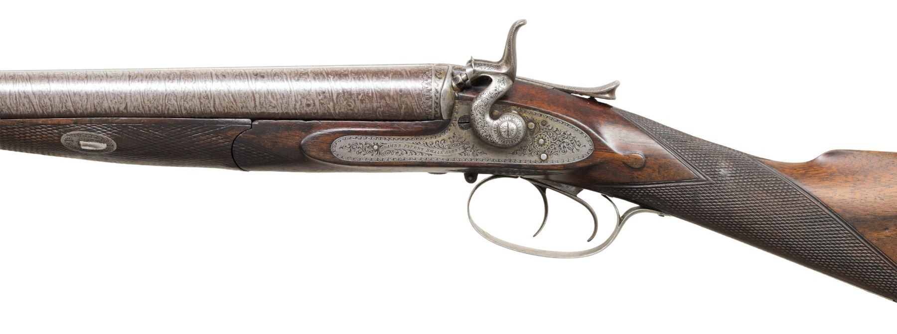 SxS SHOTGUN. Cal. 12ga, opened to 2 3/4". S# 231. Bbls 30" damascus steel. Rib is marked "ADAMS PATENT SMALL ARMS COMPANY 797 STRAND LONDON". Water table and bottom of bbl has London proofs with added 12ga, 70mm chamber length markings. Unusual action with rear sliding top lever release. Rebounding Bar-in-Wood locks, double triggers, and extractors. Locks and fittings have 50% coverage scroll engraving. Locks have Adams Patent markings. Wedge fastened horn tipped walnut forearm and straight hand stock of fancy English walnut. Stock features hand checkering and drop points. LOP: 14 5/16" to a checkered butt with engraved steel, heel and toe caps. DAC: 1 3/4". DAH: 2 1/4". Near neutral cast. BORE DIAMETER: (RT): .726. (LT): .729. CHOKE CONSTRICTION: (RT): .004. (LT) cylinder bore. MINIMUM WALL THICKNESS: (RT): .033. (LT): .027. WEIGHT: 6lb, 13.8oz. John Adams operated at the Strand address from 1864 to July, 1881 until the operation was re-established as the William Watts Locke Co. CONDITION: bbls have lightly faded browned finish. Action and fittings have faded brown appearance. Stock and forearm show moderate finish and checkering wear with scattered scratching and marks. Sound action and lock. Good bright bores. (01-28492/DS). ANTIQUE. $800-1,200.