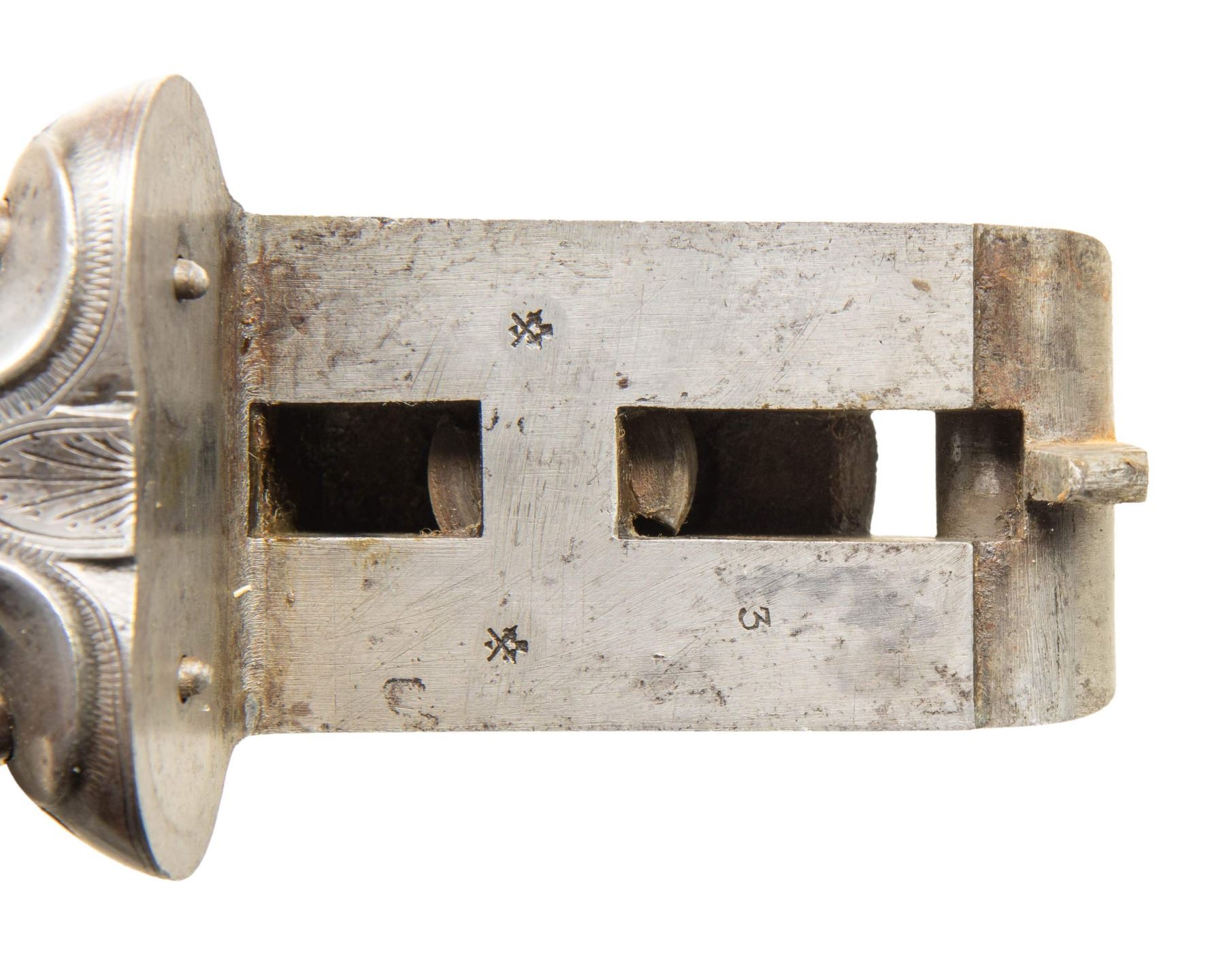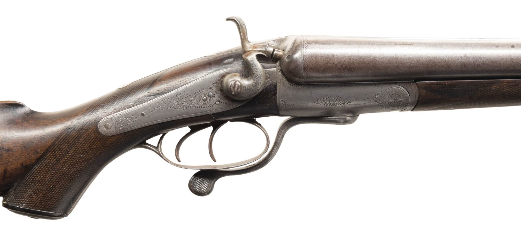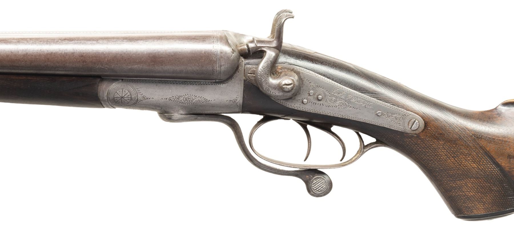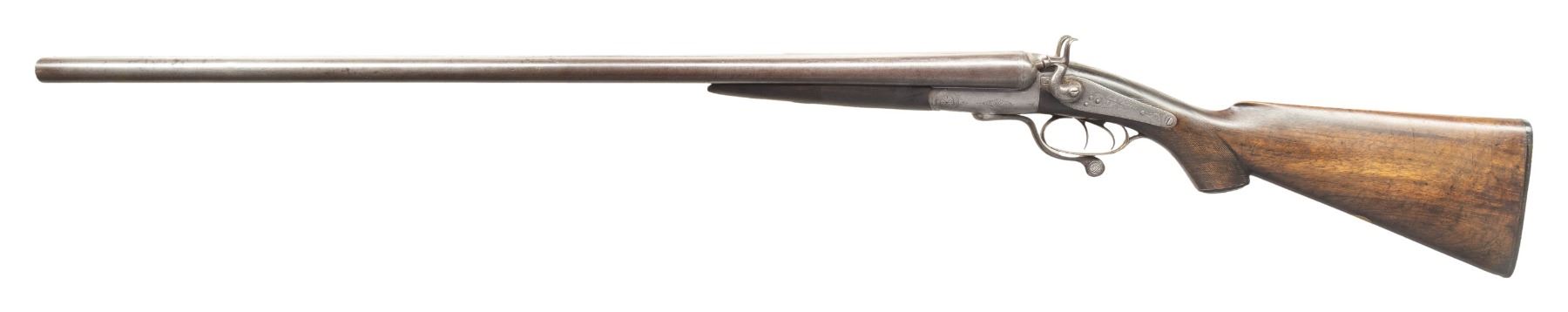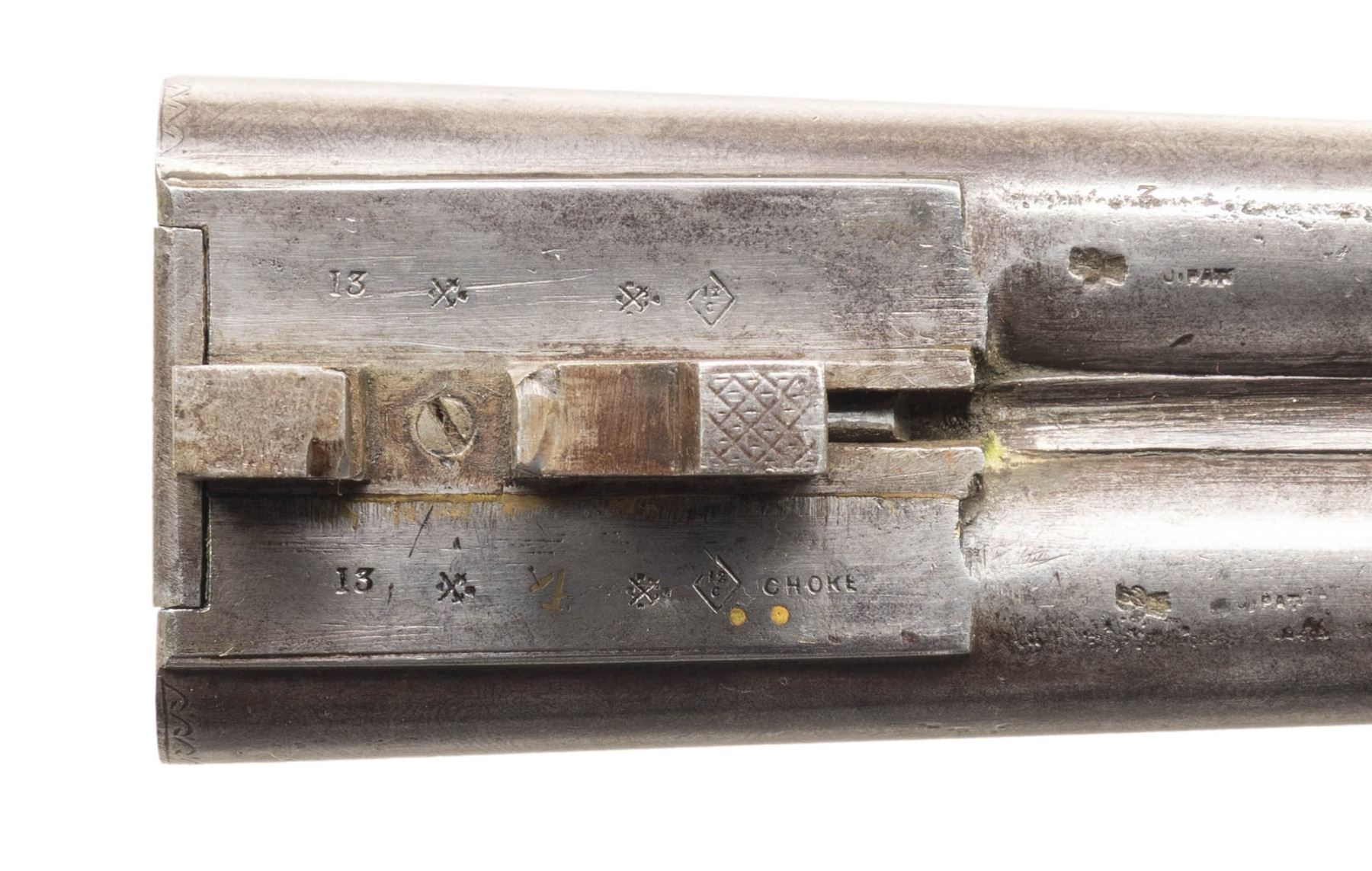 SHOTGUN. Cal. 12 Ga., 2 1/2". (13 Bore). S# 3 (#1443 on rib address). The Best Damascus 30" barrels have pre-1896 Birmingham proofs; chokes appear to measure Full & Mod. Round bodied back action lock action has side-swivel under lever, dbl. triggers & extractors. Walnut stock set w/ splinter forearm, hard rubber grip capped buttstock w/ brass oval toeplate. LOP: 13.25" to hard rubber buttplate. CONDITION: metal has gray patina appearance; cleaned pitting on bottom of barrel. Wood has worn appearance with almost smooth checkering & dings. Forearm is mising tip. Buttplate shows sm. chips. Bores show light pitting & scratches. (01-28495/MD). ANTIQUE. $500-800.