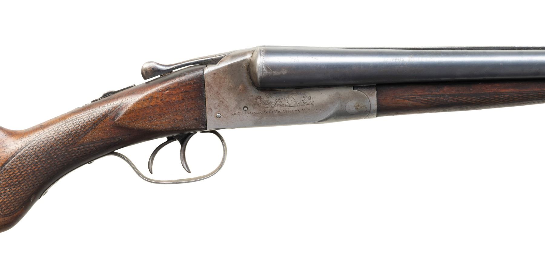 SHOTGUN. Cal. 16 Ga. S# 223146 (Mfg. 1912). Smokeless steel 26" bbls. w/ brass front bead; fixed Full & Mod chokes. Boxlock action w/ dbl. triggers & extractors. Checkered walnut stock set; LOP: 13 3/8" to hard rubber Ithaca buttplate. UNATTACHED ACCESSORIES: snap caps. CONDITION: good barrel blue with muzzle & chamber edge wear, scattered sm. dents & peppery oxidation. Action balance faded to gray with patina & marks; good case colors in protected areas. Sanded & refinished wood has worn checkering & peeling finish along toeline. Bore shows light scratches & fouling. PROVENANCE: Estate of Groves Herrick. (25-5736/MD). CURIO. $400-600.