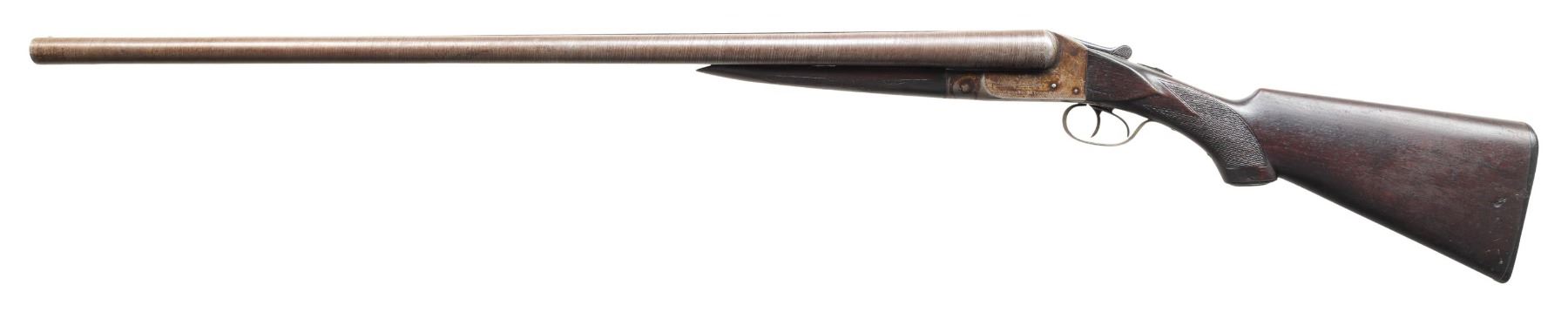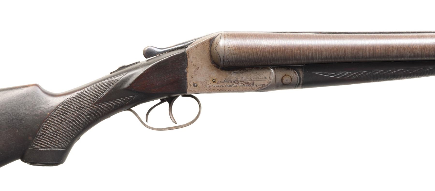 Cal. 10 Gauge. S# 267073 (1915). The matching numbered 32" barrels have matted rib with brass front bead. "4" stamped chokes on water tables. Boxlock action w/ dbl. triggers & extractors. Walnut stock set w/ matching numbers on forearm & hard rubber grip cap. LOP: 13.5" to hard rubber Ithaca buttplate. CONDITION: barrels & action have gray/brown patina appearance with corrosions along edges of action, rib & forearm edges. Wood has a dark worn appearance with worn checkering, sm. gouges, white paint spots & hairline cracks. Action appears tight. Bores show pitting. PROVENANCE: Estate of Groves Herrick. (25-5643/MD). CURIO. $300-500.