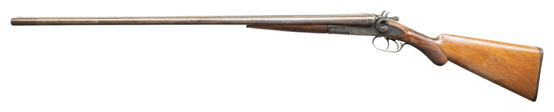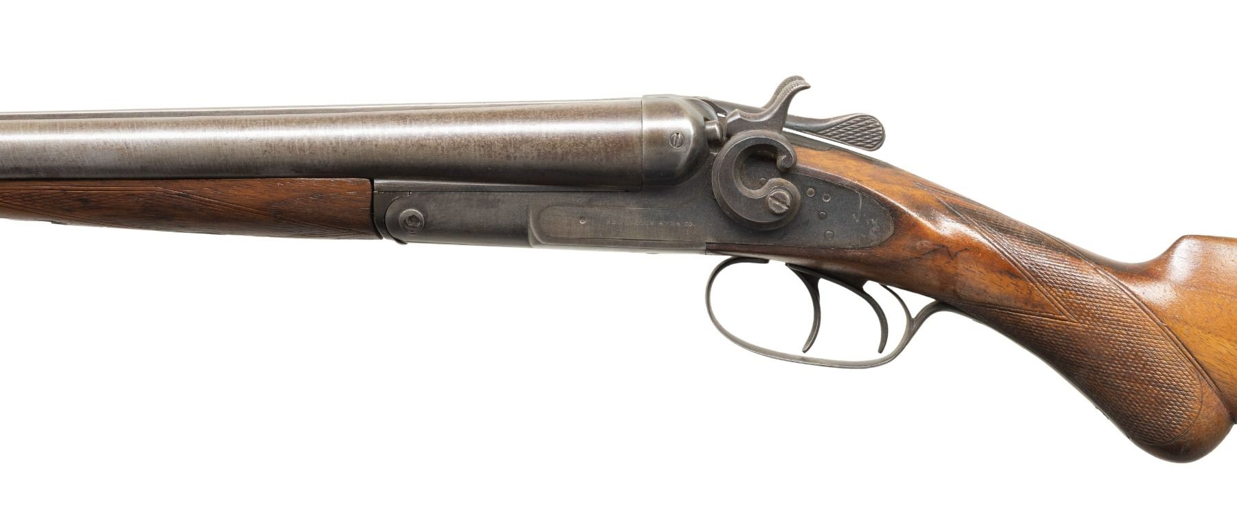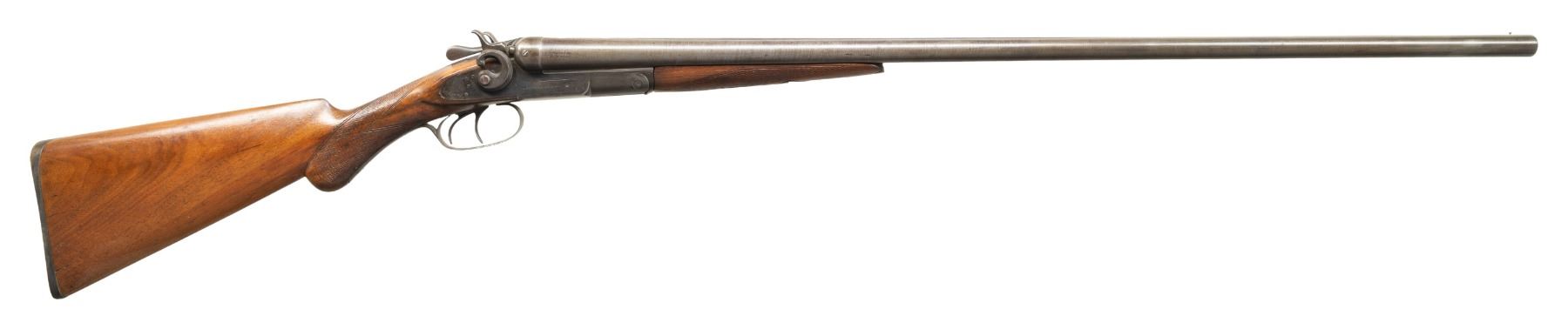 Cal. 16 Ga. S# 247806 (1905). Bbls. 32" w/ steel bead. Fixed Imp. Mod chokes. Action has dbl. triggers, extractors & rebounding hammers. Walnut stock set. CONDITION: barrels have gray/brown patina with spots of oxidation. Receiver has case colors in protected areas with balance being brown patina. Sanded & refinished wood has light marks. Bores show deep pitting. PROVENANCE: Estate of Groves Herrick. (26-1126/MD). CURIO. $200-400.