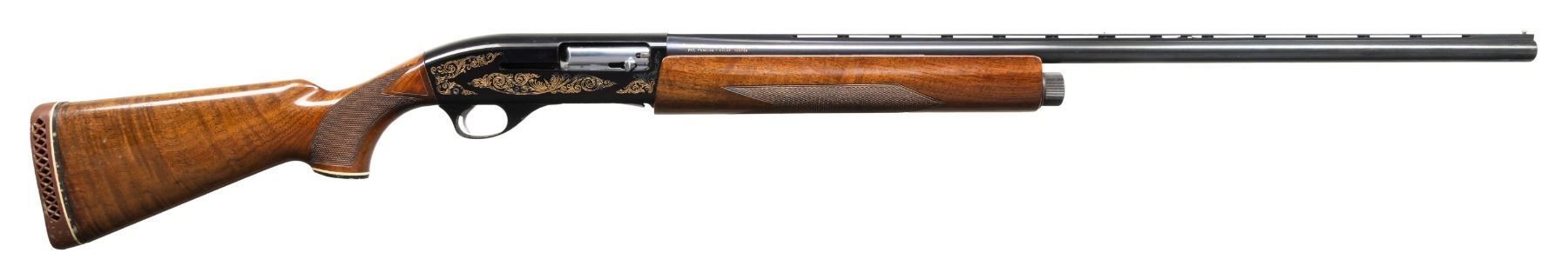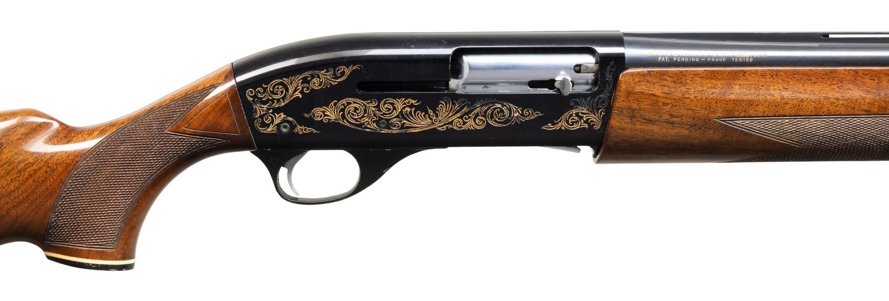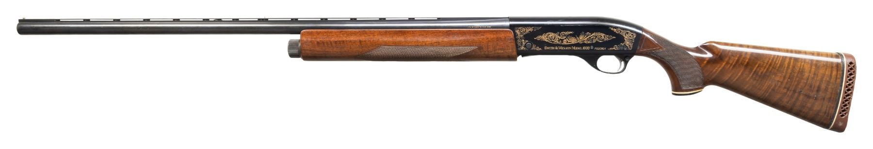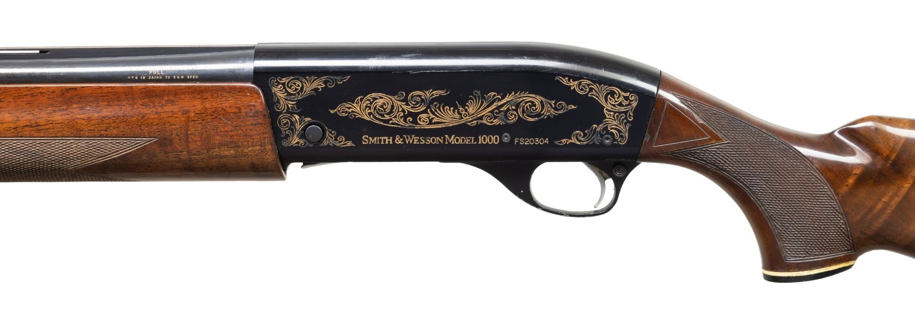 Cal. 12 Ga. 2 3/4". S# FS20304. Bbl. 30" with VR & choked full. Bead sights. Japanese made S&W shotgun. Blued finish with gold colored scroll engraving on receiver. Checkered walnut pistol grip stock set with Pachmayr White Line recoil pad. LOP: 14". CONDITION: butt stock is loose & will require attention to tighten. Stock set otherwise shows some moderate finish loss & scattered handling marks. Metal retains 85% blue & anodizing with scattered edge wear, light oxidation & handling marks. Action functions properly when hand cycled. Bright near excellent bore. (25-4805/MJC). MODERN. $400-600.