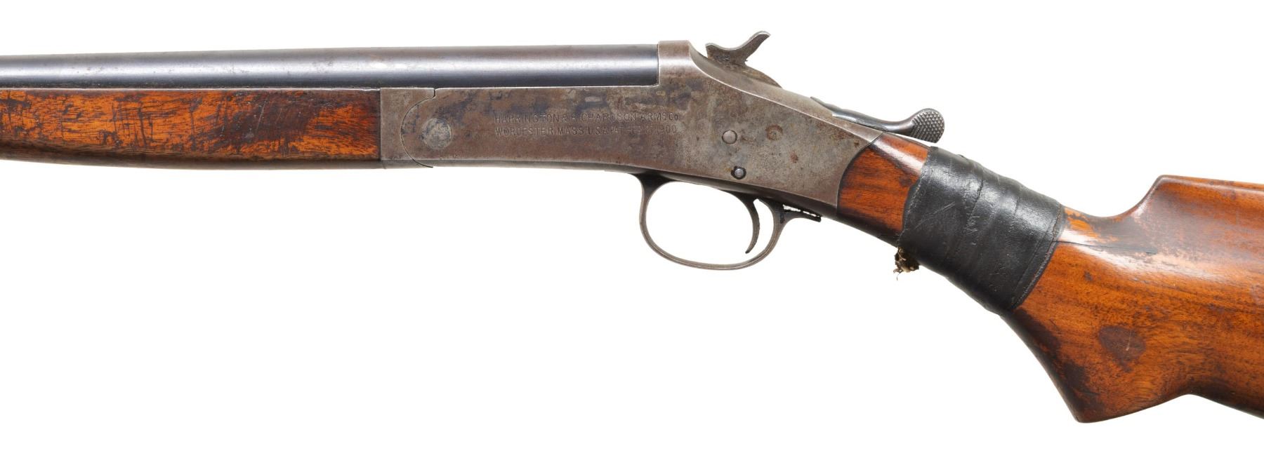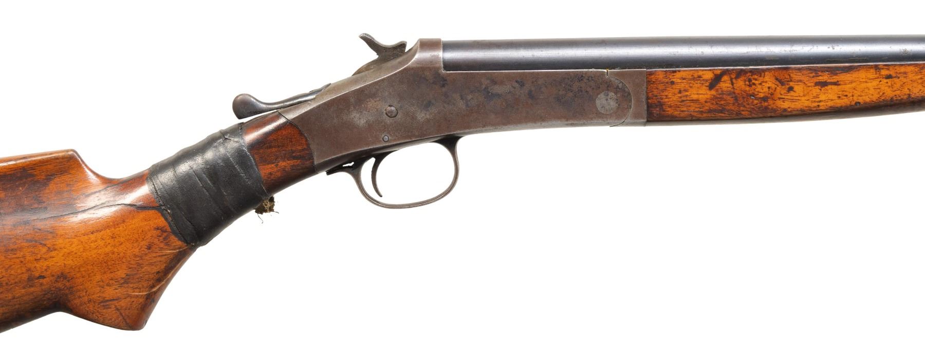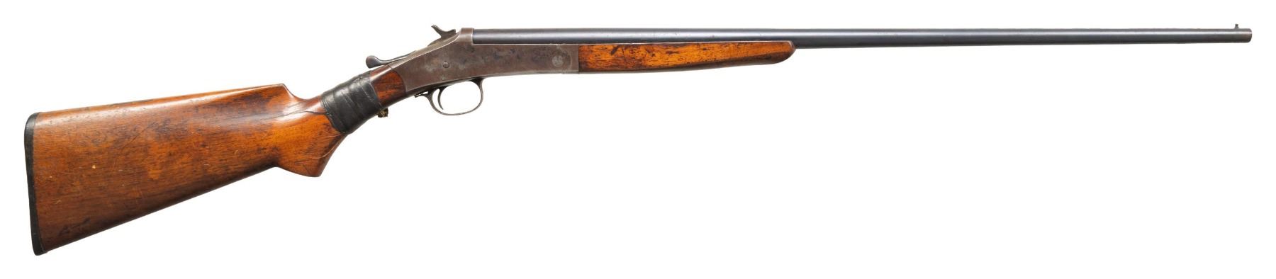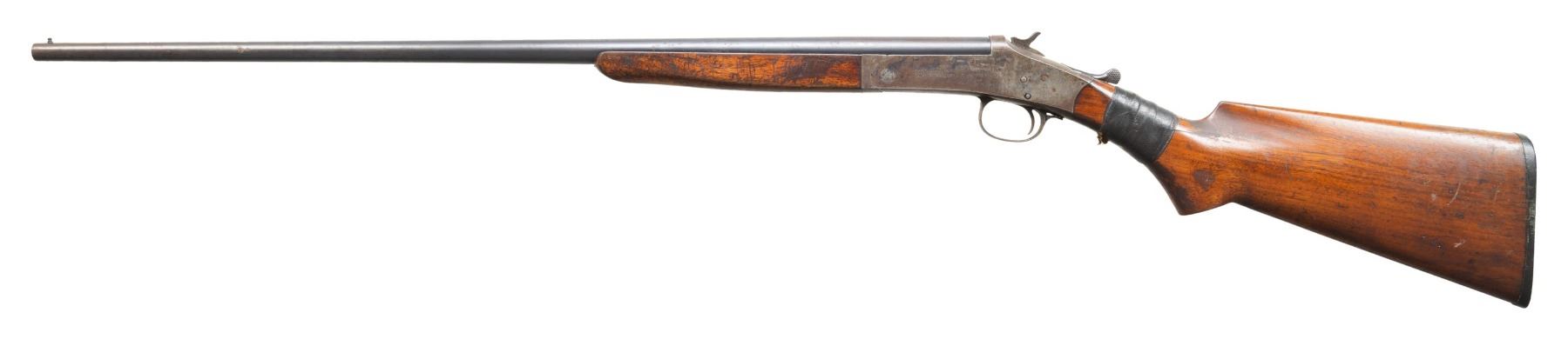 Cal. 410. S# A5519. Bbl. 26" w/ steel bead & Mod choke. Boxlock action w/ external hammer & ejector. Walnut stock set. CONDITION: Fair barrel blue mixing with brown patina with spots of pitting & oxidation. Receiver has gray/brown patina appearance with traces of case colors showing spots of oxidation. Buttstock has tape repair at wrist with large cracks. Shiny bore with pitting forward of chamber. PROVENANCE: Estate of Groves Herrick. (25-5646/MD). CURIO. $50-100.
