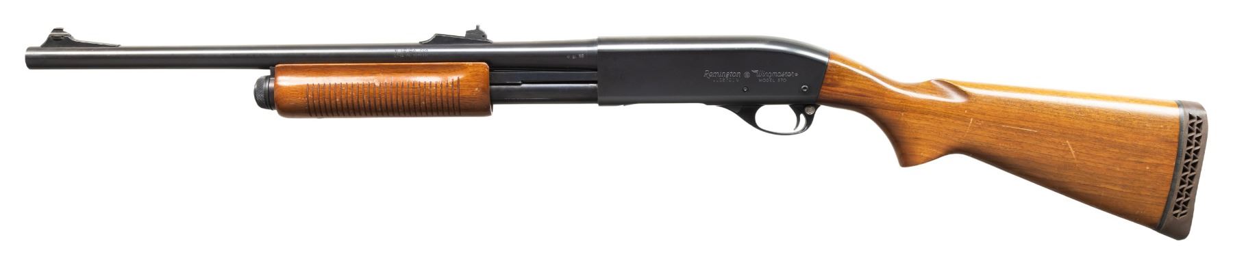 1) Remington 870 Wingmaster Pump Action Shotgun. S# V102701V. Bbl. 20" smoothbore. Bead front sight. Adjustable rifle style rear sight. Blued finish. Trigger guard has metal inventory tag. Walnut pistol grip stock with factory recoil pad & grooved forend. LOP: 13 3/4". Right side of butt has "RIPD 33" marking likely for Riverview, Michigan police department. CONDITION: stock set shows scattered handling marks, light finish wear & dings. Metal retains 95% original blue with a spot of light oxidation on right side of receiver, some handling marks & operational wear. Action functions properly when hand cycled. Bright near excellent bore. (25-5842/MJC).