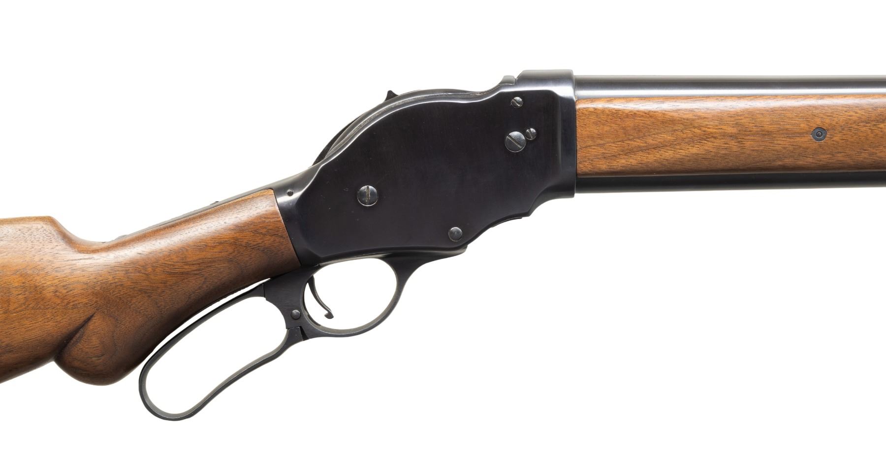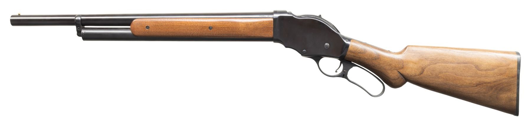 2) Norinco 87 Lever Action Shotgun. S# 0501871 . Bbl. 20". Bead front sight. Chinese made replica of the 1887 Winchester shotgun. Tang has IAC import marking. Blued finish. Walnut stock set. CONDITION: stock set & metal show light handling marks & wear. Action functions properly when hand cycled. Near excellent bright bore. PROVENANCE: From the PMRB Collection. (25-5956/MJC). BOTH MODERN. $500-900 for lot.