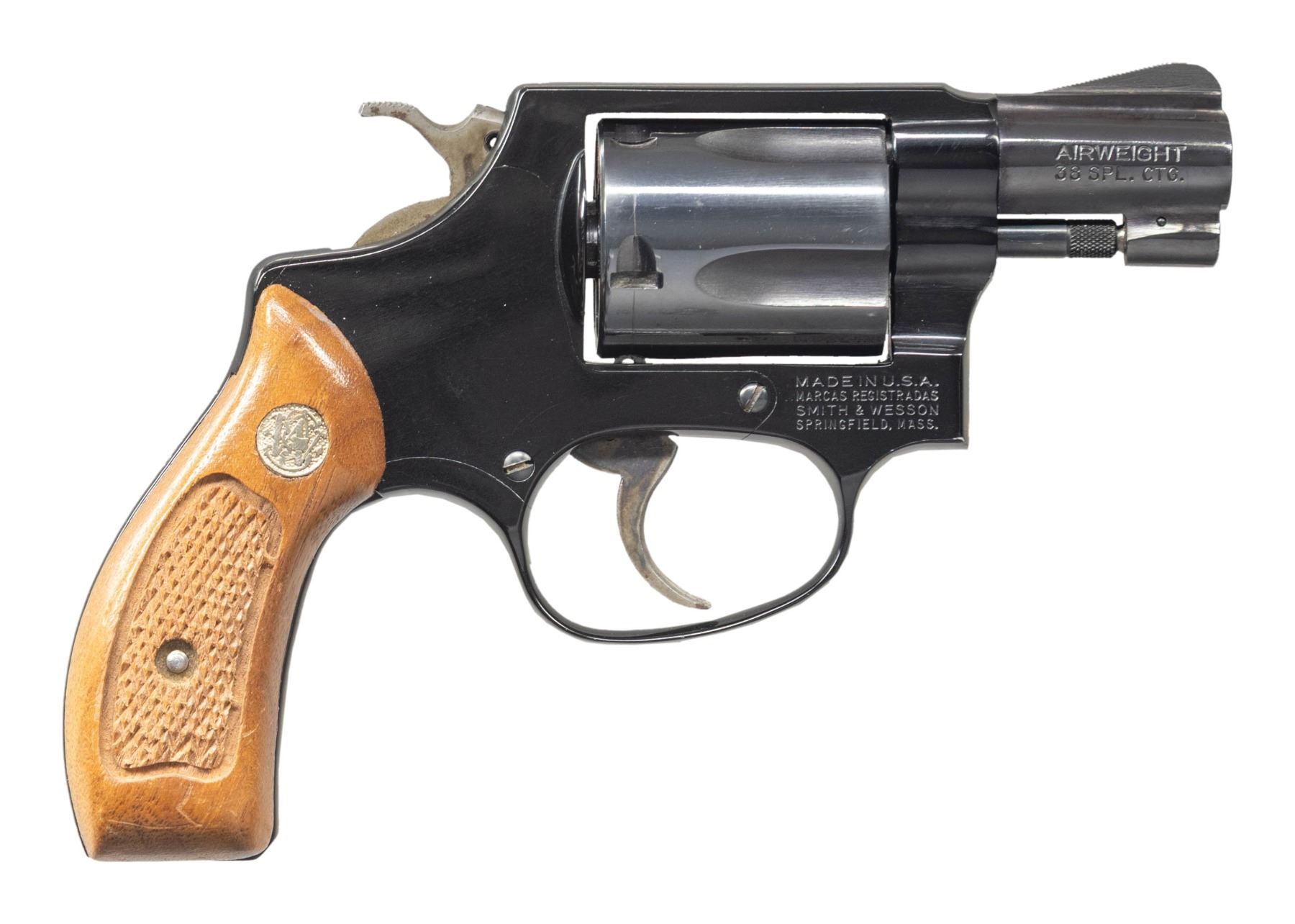 Cal. 38 Spl. S# AAS0082. Bbl. 2". Ramped serrated blade front sight. Fixed rear sight. 1980s production 37 no-dash revolver. Blued finish with case colored trigger & hammer. Checkered walnut grips with silver S&W medallions. CONDITION: grips show scattered light scratches & handling marks. Hammer & trigger retain most of their case colors with some operational wear & a couple oxidation specks. Balance of metal retains 98% original blue with a light turn line on cyl. & some handling marks. Action functions properly when hand cycled. Bright near excellent bore. (25-5258/MJC). MODERN. $400-600.