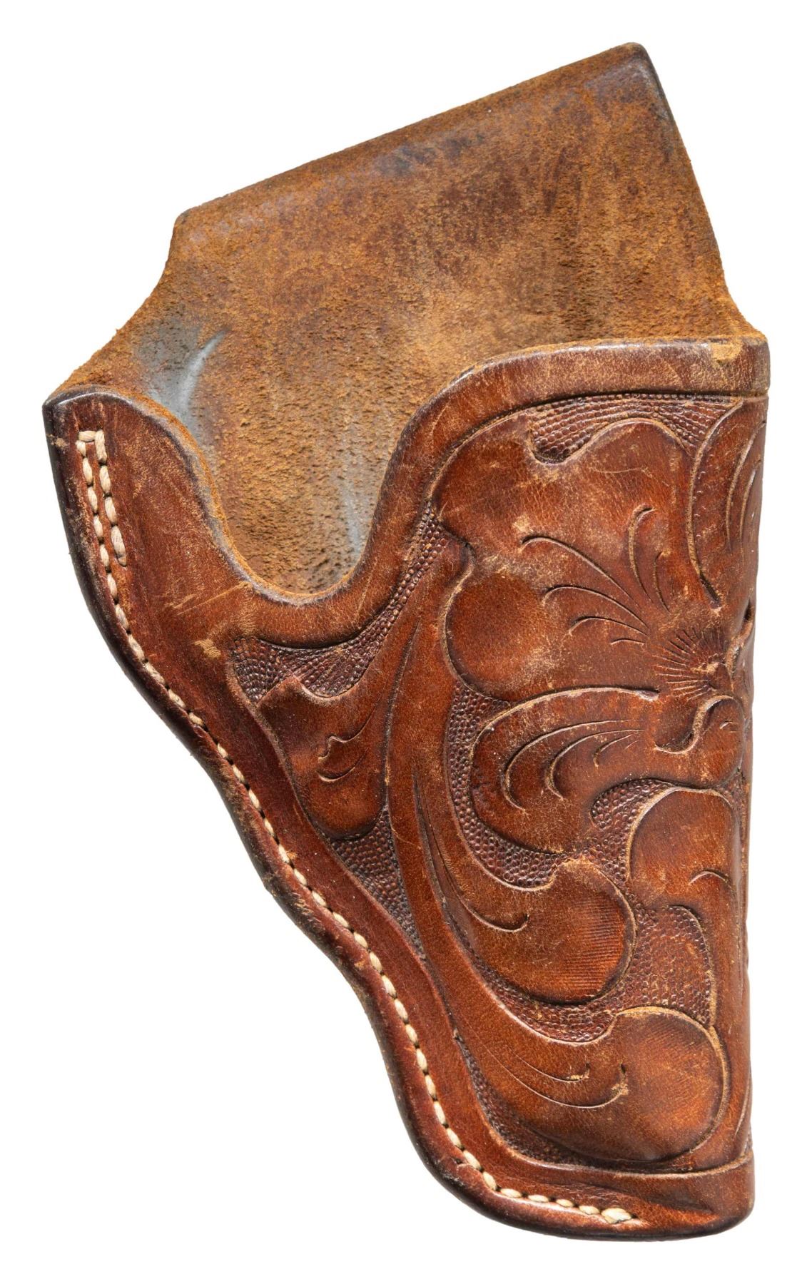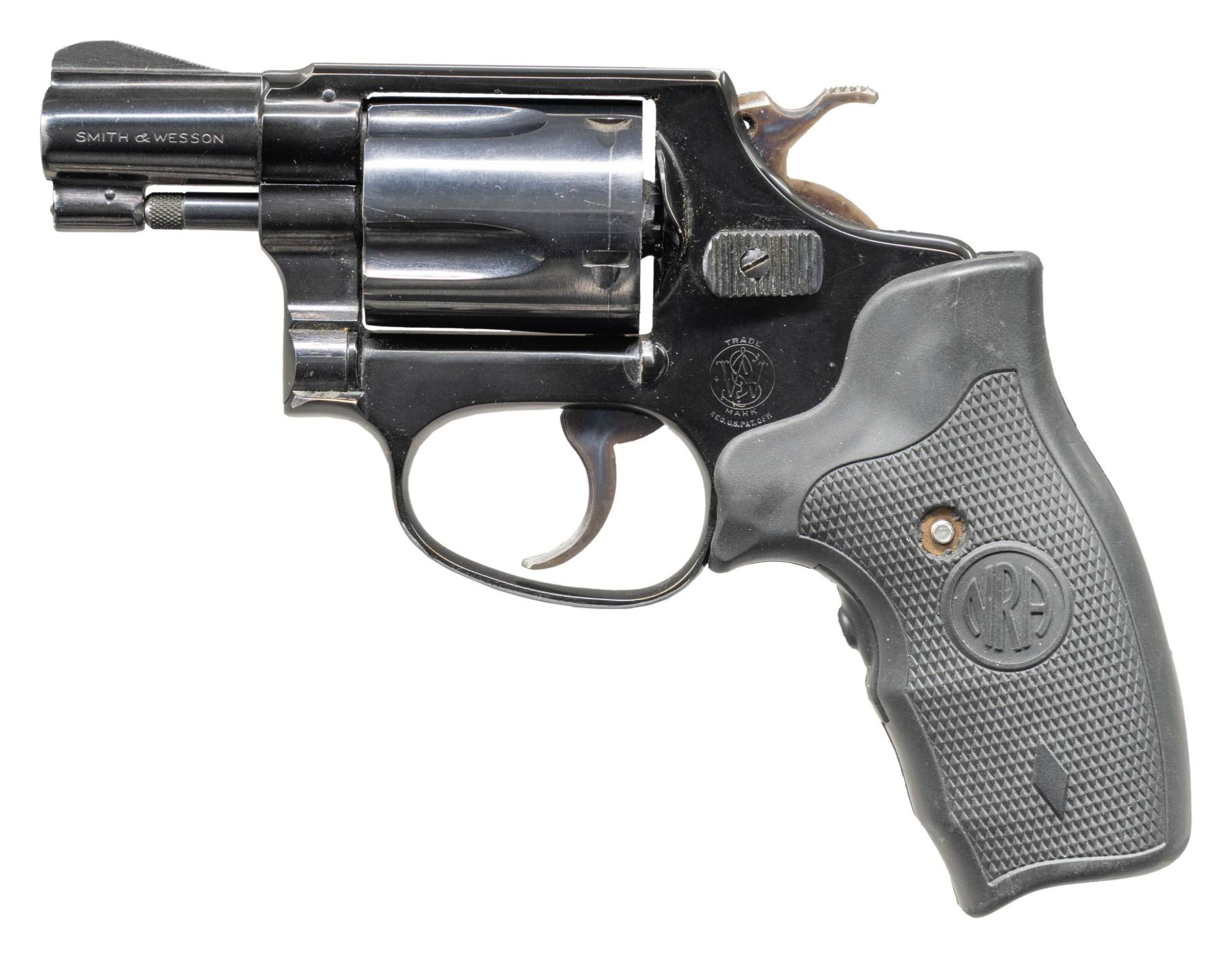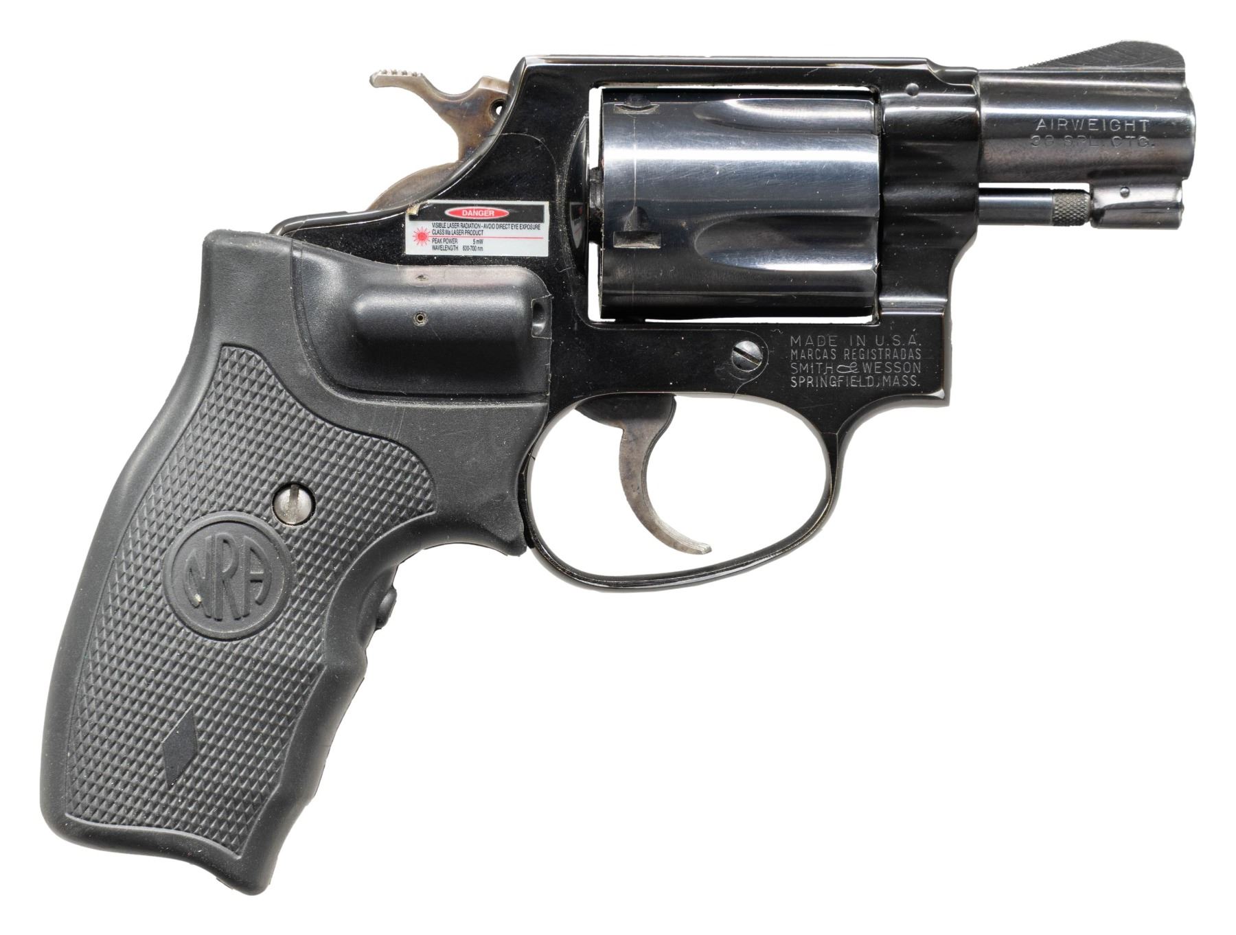 Ramped serrated blade front sight. Fixed rear sight. 5-shot cyl. Flat latch. 1950's made pre-Model 37 Airweight revolver. NRA red laser grips that are still functioning. Laser sticker present on right sideplate. UNATTACHED ACCESSORIES: right handed leather holster. CONDITION: grips show some handling marks. Trigger & hammer retain most of their case colors with some operational wear & oxidation specks. Balance of metal retains 95% blue with some edge & handling wear. Action functions properly when hand cycled. Bright near excellent bore. PROVENANCE: Estate of Groves Herrick. (25-5693/MJC). CURIO. $300-500.