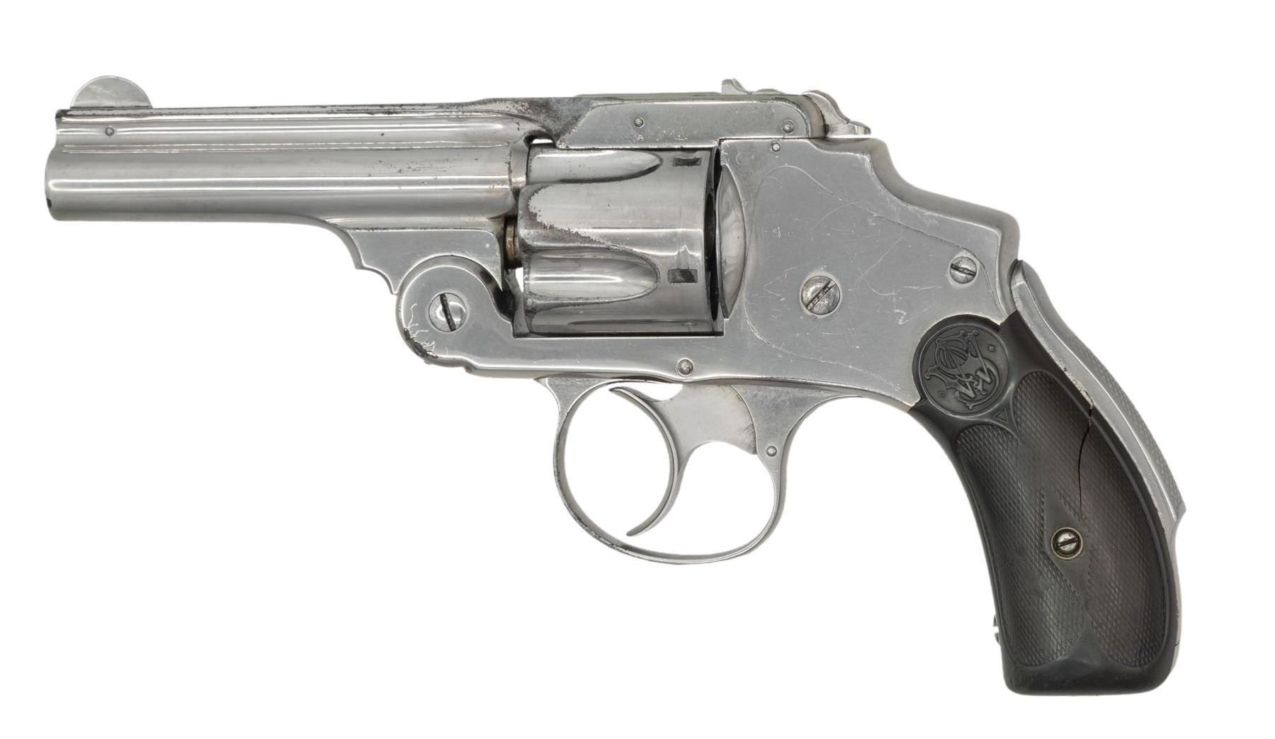 Cal. 38 S&W. S# 42386. Bbl. 3 1/2". Round blade front sight. Fixed rear sight. Matching numbers on frame, bbl., & cyl. 5-shot cyl. Renickel finish. Checkered brown hard rubber grips with matching pencil numbered right panel & S&W monograms. CONDITION: grips show a few cracks most notable on left panel, overall heavy checkering wear,, some dings & handling marks. Metal retains 90% old renickel with scattered flaking, handling marks & oxidation. Action functions properly when hand cycled. Bore shows oxidation & dried grease but strong rifling. (01-28760/MJC). ANTIQUE. $300-400.