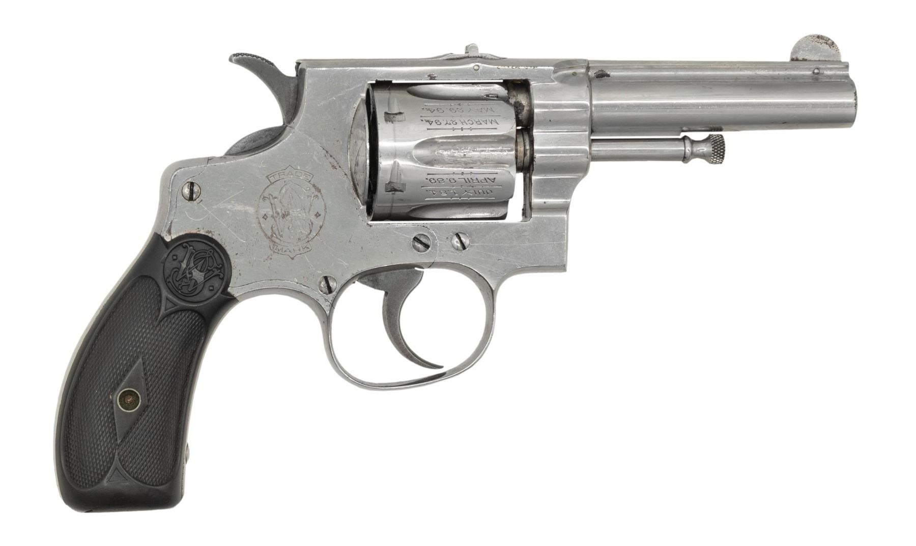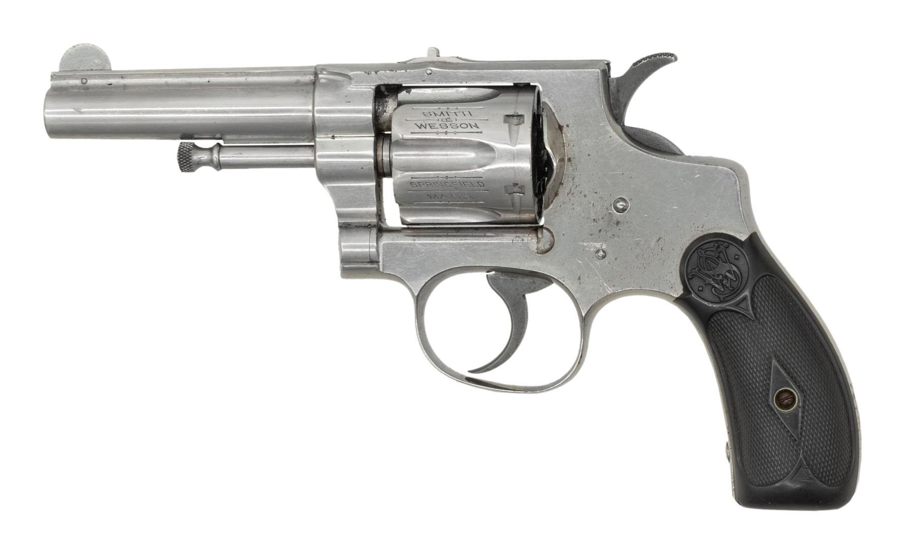 Cal. 32 S&W Long. S# 5448. Bbl. 3 1/4". Round blade front sight. Fixed u-notch rear sight. Matching numbers on frame, bbl. & cyl. Extractor number is illegible due to grease & oxidation. 6-shot cyl. Early First Model 32 Hand Ejector. Nickel finish with case colored hammer & trigger. Checkered hard rubber grips with mismatch number right panel & S&W monograms. CONDITION: grips show a couple cracks on bottoms, some checkering wear & handling marks. Hammer & trigger turning gray with traces of case colors, oxidation & edge wear. Balance of metal retains 90% original nickel with scattered oxidation, scratches, operational wear, handling marks & light flaking. Action functions properly when hand cycled. Bore has good rifling with scattered dried grease & oxidation. (01-28759/MJC). ANTIQUE. $300-500.
