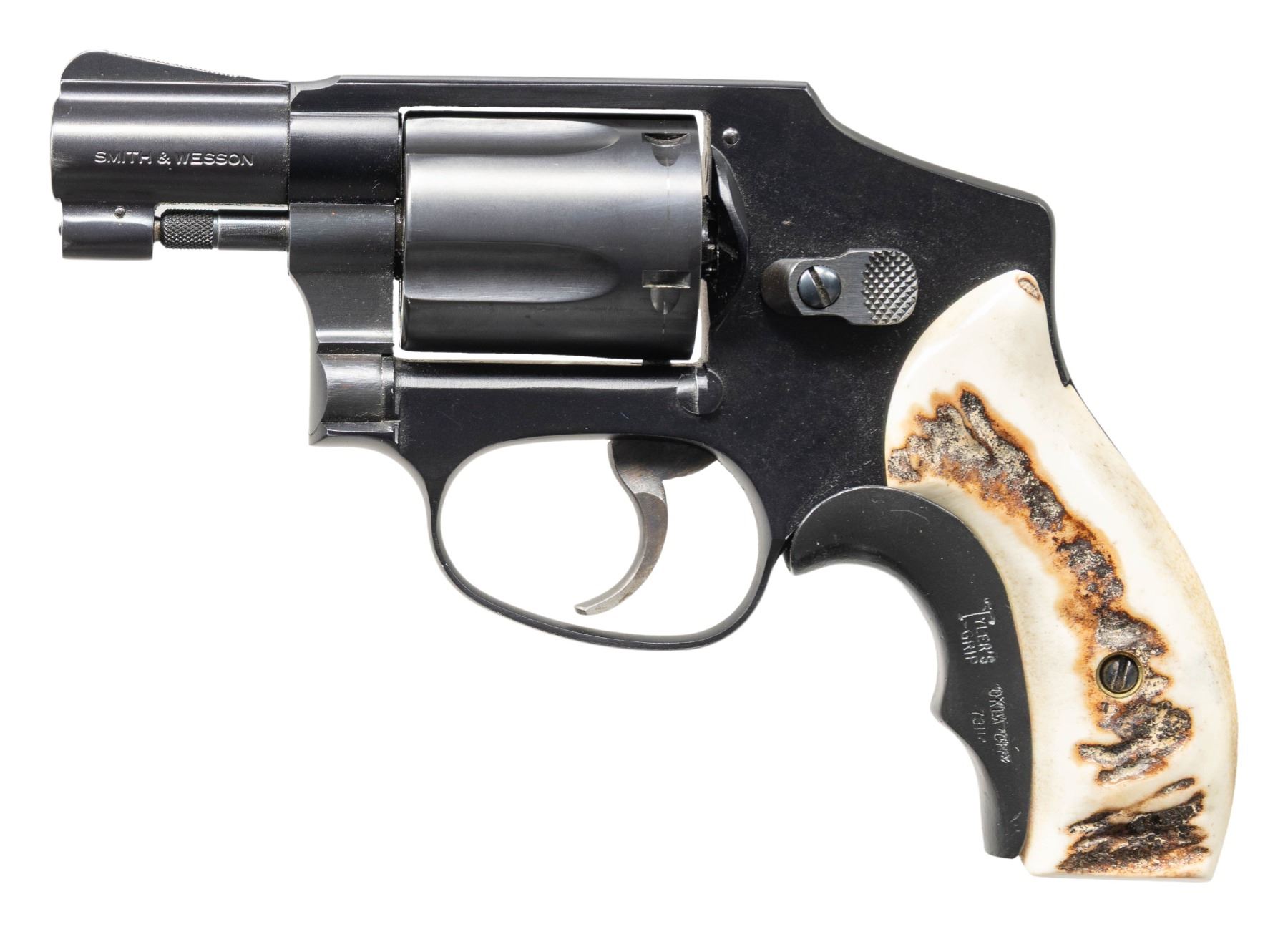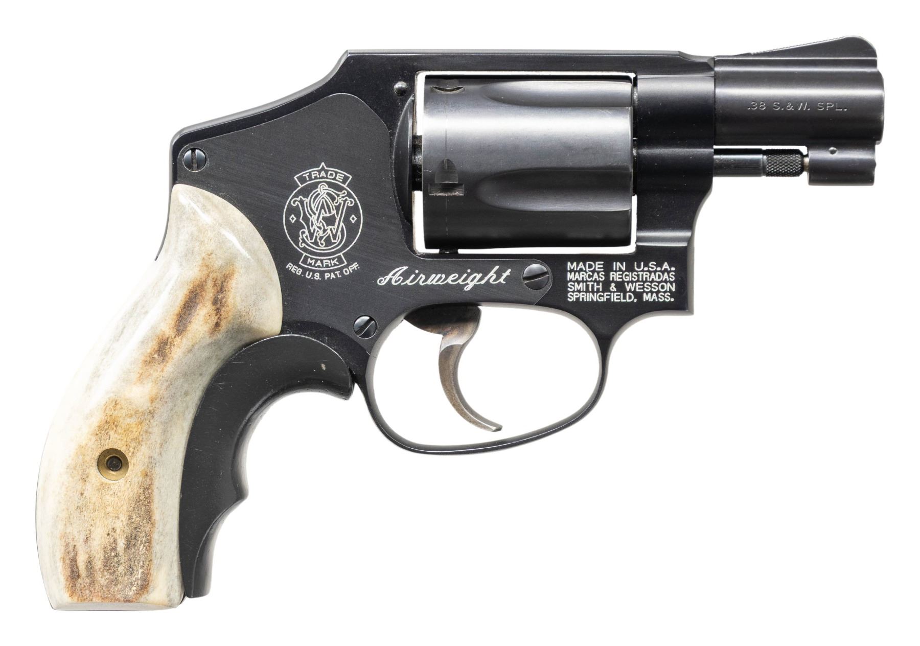 1) S&W Model 442. Cal. 38 Spcl. S# BRW0077. Bbl. 1 7/8". Ramped serrated blade front sight. Fixed rear sight. Airweight 442 without internal lock. 5-shot cyl. Matte black finish with case color trigger. Bone style grips with Tyler grip adapter. CONDITION: grips show a couple dings & some handling marks. Metal retains most of its matte black & case color finishes with some edge wear, handling marks & light oxidation specks. Action functions properly when hand cycled. Near excellent bright bore with some dried grease. (25-4618/MJC).