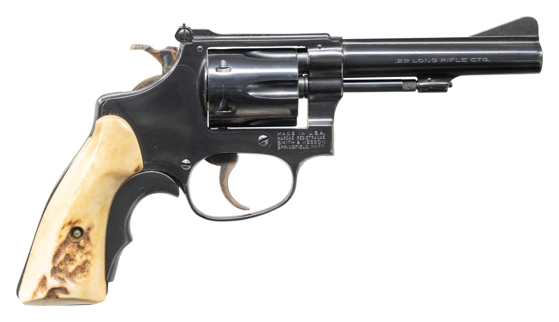2) S&W 34-1. Cal. 22 LR. S# M76429. Bbl. 4" pinned. Ramped serrated blade front sight. Adjustable square notch rear sight. 6-shot recessed cyl. Blued finish with case colored hammer & trigger. Bone style grips with Tyler grip adapter. CONDITION: grips show light handling wear. Hammer & trigger retain most of their case colors with some light operational wear. Balance of metal retains 97% original blue with some light handling & edge wear. Action functions properly when hand cycled. Bright near excellent bore. (25-4686/MJC). BOTH MODERN. $700-1,200 for pair.