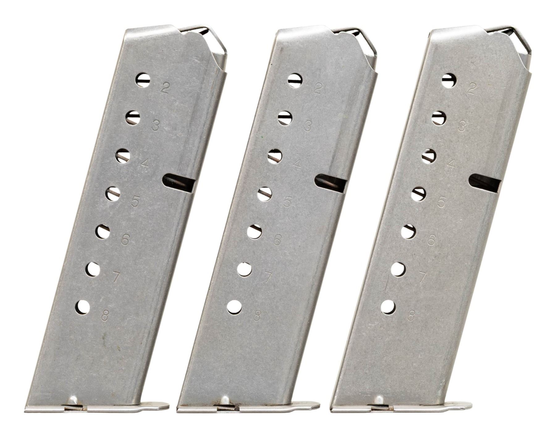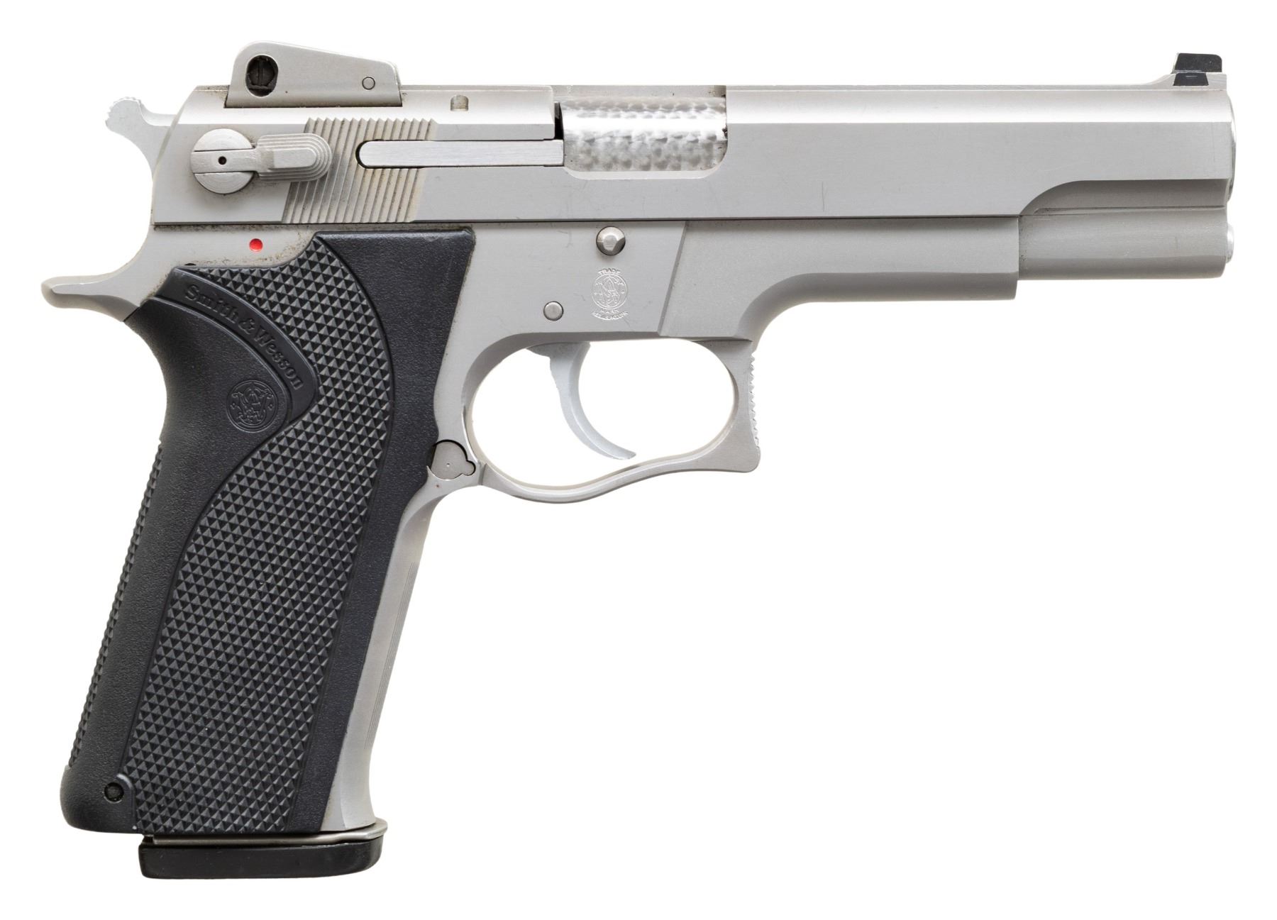 Cal. 45 ACP. S# TCD6950. Bbl. 5". Three dot sights with adjustable rear. Ambi safety that also acts as a decocker. Stainless finish with ejection port area of bbl. having a jeweled finish. Checkered black grips with S&W monograms. MAGS: 4-8 rd. CONDITION: grips show light handling wear. Metal shows scattered handling marks & scuffs. Action functions properly when hand cycled. Bright near excellent bore. (25-4861/MJC). MODERN. $400-600.