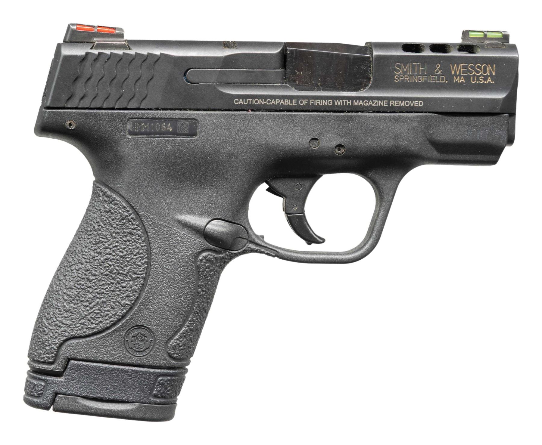 Cal. 40 S&W. S# HMM1064. Bbl. 3 1/3". Fiber optic sights. Ported Performance Center M&P Shield pistol. Matte black finish. Various markings have added yellow highlight. Polymer frame. MAGS: 1-7 rd. & 1-6 rd. Total of 2. UNATTACHED ACCESSORIES: matching numbered factory box with trigger lock & manual. CONDITION: frame & slide shows scattered handling marks & light carry wear. Action functions properly when hand cycled. Near excellent bore. (25-4888/MJC). MODERN. $400-600.