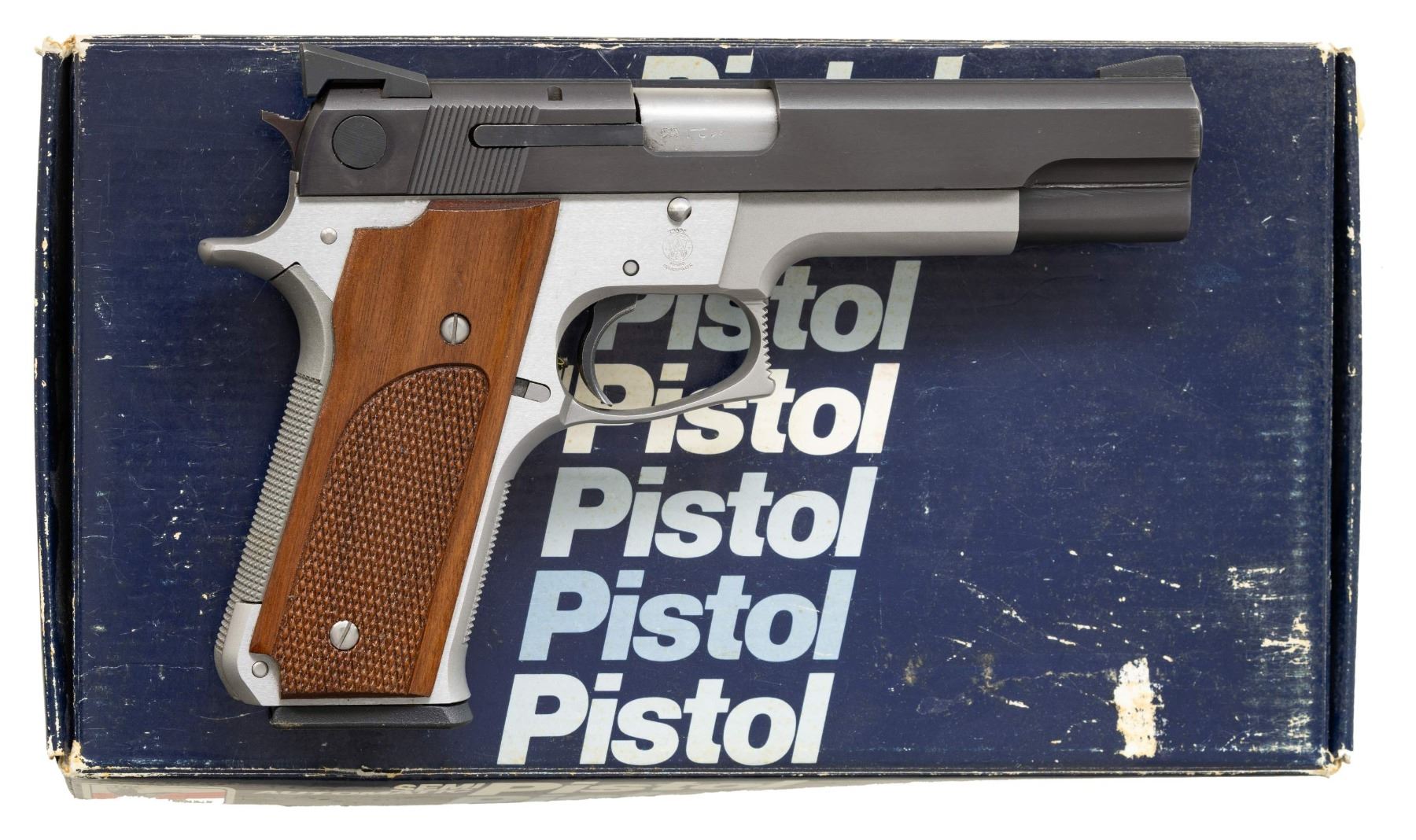PISTOL WITH MATCHING BOX. Cal. 45 ACP. S# TBN3465. Mfg.1988 w/ stainless frame & bbl. having blued slide plus accents. Bbl. 5". Frame marked "WISCHO" below "MODEL" which is Germany's major firearms distributor similar to Lew Horton's of the USA. Frame & bbl. have script "L" in flaming bomb proof as used by Belgium post 1968. Enhanced features include oversized & extended mag release, oversized LH slide mounted safety, Novak style rear sight, serrated ramped front sight, checkered walnut grips w/out medallions plus checkered grip straps. MAGS: 2 stainless factory 8 rd. TOTAL; black plastic base w/ yellow follower & flat stainless base w/ orange follower. UNATTACHED ACCESSORIES: original matching numbered 1 piece factory box w/ paperwork. CONDITION: very light blue wear as if from holstering; overall about near excellent w/ grips. Balance of bore has strong rifling, but has bulge forward of chamber. (23-617/NW/MD). MODERN. $300-500.