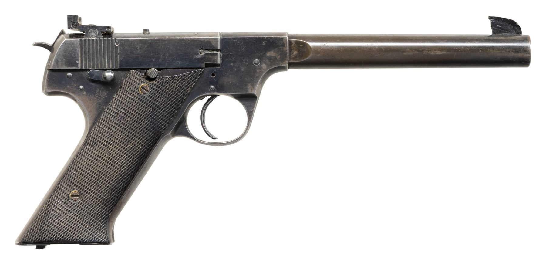 Cal. 22 LR. S# 147040. Bbl. 6 3/4". Crude replacement blade front sight. Adjustable Micro replacement rear sight. Blued finish. Checkered hardwood grips. MAGS: none present. CONDITION: grips have a darkened refinish appear with added imprint for a thumb on left panel, a few dings, some staining & scattered handling marks. Metal retains 30% blue with overall fading to gray, some scattered edge wear, oxidation, handling marks & perhaps some faded old touch up blue on bbl. Action functions properly when hand cycled. Very good bore with strong rifling. PROVENANCE: Estate of Groves Herrick. (25-5691/MJC). CURIO. $300-500.