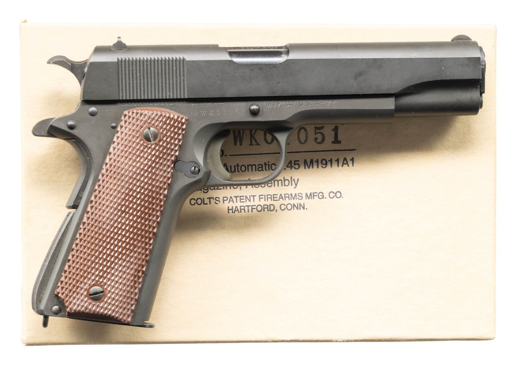 SEMI AUTO PISTOL WITH COLT BOX. CAL. 45 ACP. S# WK01051 (2001). One of approx. 4,000 mfg. 2001-2004 as a replica of World War II era Colt M1911A1 with parkerized finish & brown composite grips. MAGS: 2 - 7 RD. UNATTACHED ACCESSORIES: blue Colt box contains original style matching numbered box, lock, & paperwork. CONDITION: near excellent overall including bore. PROVENANCE: Estate Collection of John "Jack" Dhooghe. (25-5527/MD). MODERN. $800-1,200.