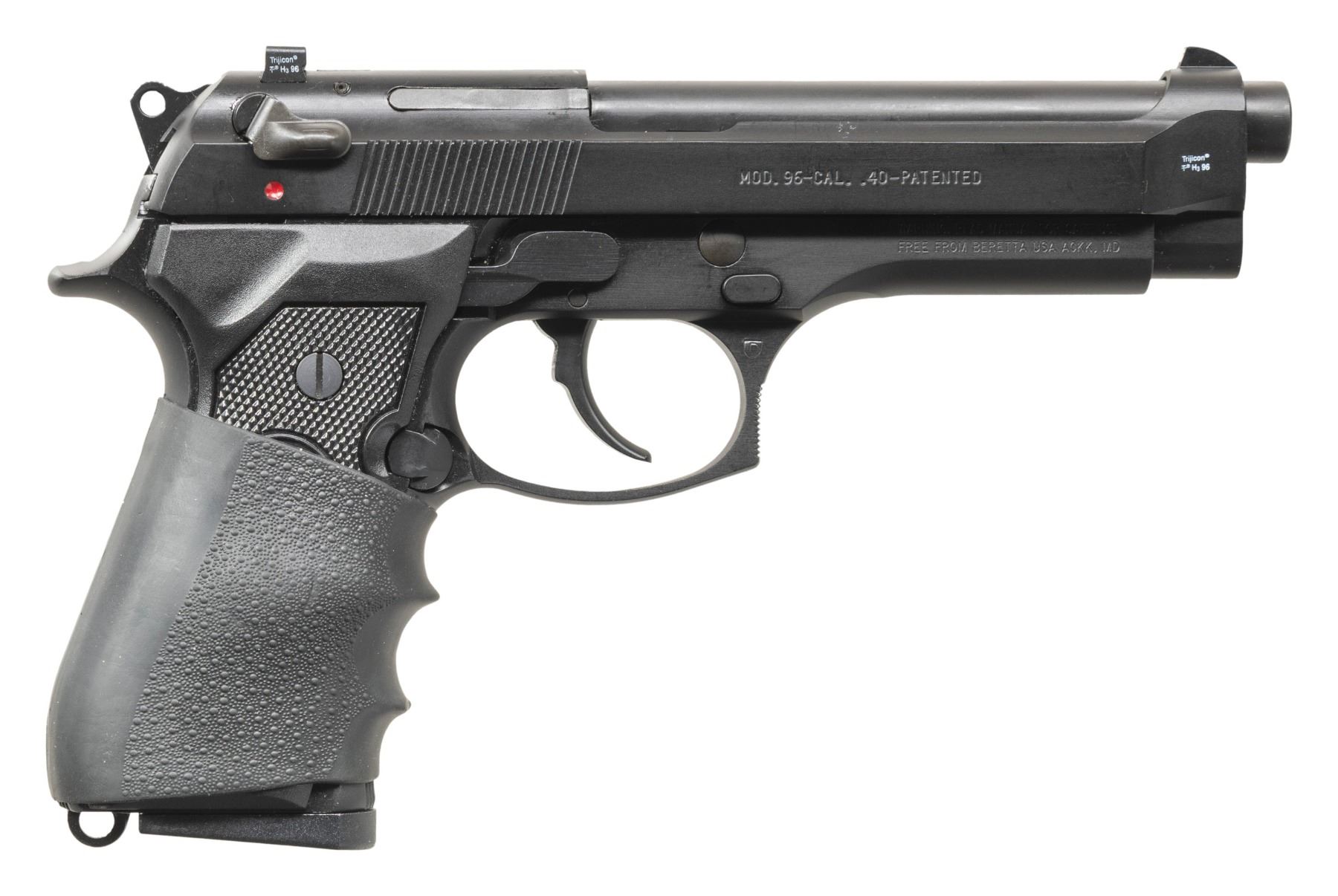 Cal. 40 S&W. S# BER006646. Bbl. 4 7/8". Three dot Trijicon night sights. Maryland made Beretta 96 pistol. Ambi manual safety that also acts as a decocker. Matte black finish. Checkered black factory grips with slip-on finger groove extension. MAGS: 3-10 rd. UNATTACHED ACCESSORIES: factory hardcase & manual. CONDITION: grips & metal show light handling wear & marks. Action functions properly when hand cycled. Bright near excellent bore. (25-5255/MJC). MODERN. $500-800.