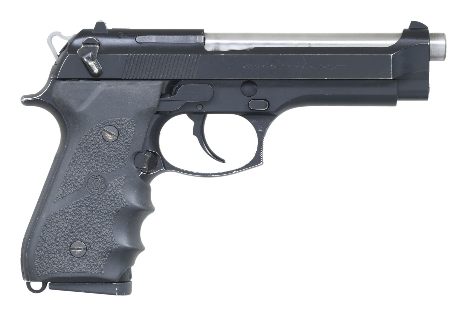 Cal. 9mm Para. S# D32221Z. Mfg. 1988. Bbl 4.9". Black finished slide w/ replacement skeletonized hammer, fixed sights & safety. Matte black frame w/ Hogue rubber grip. MAGS: 2 - 15 rd. CONDITION: very good black finish with handling wear. Barrel has large portions of finish taken off. Very good bore w/ frosting in the grooves. (26-255/MD). MODERN. $400-600.