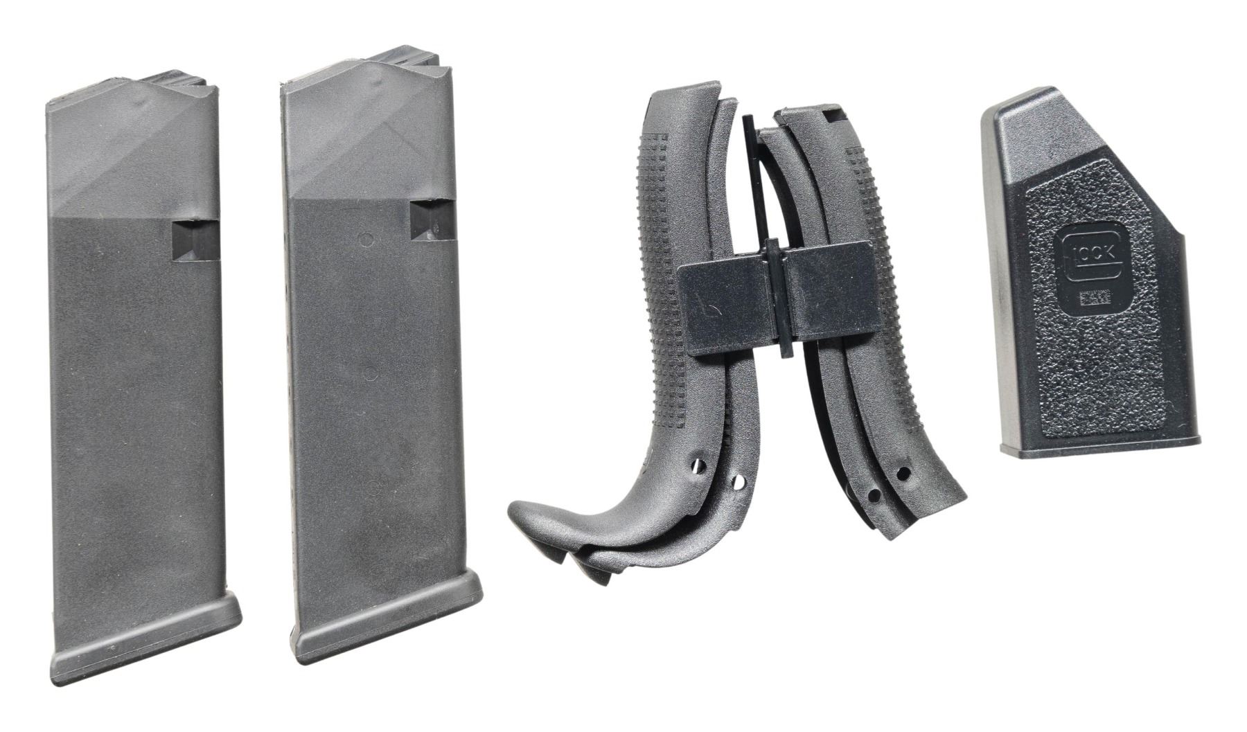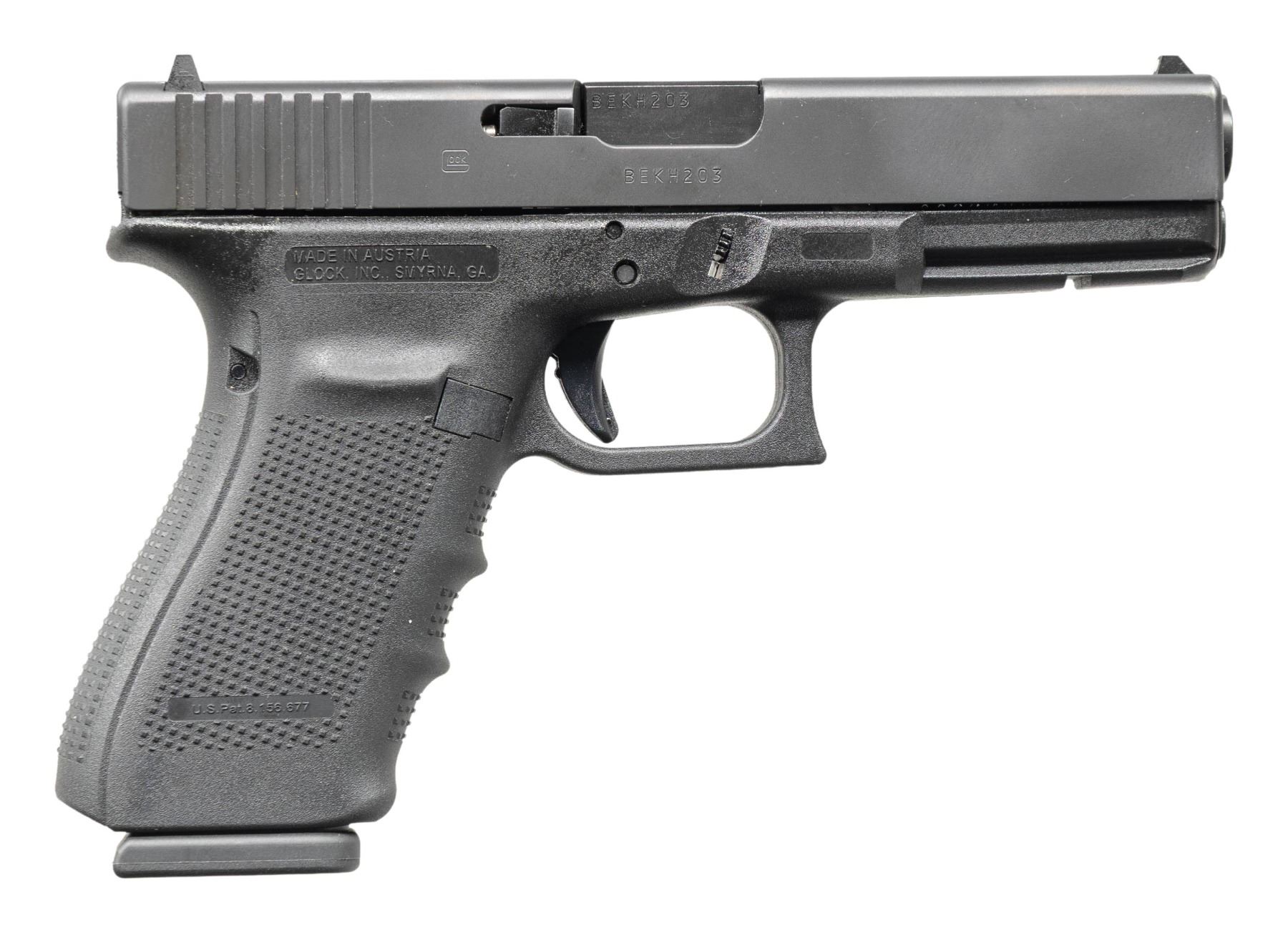 Cal. 10mm. S# BEKH203. Bbl. 4 5/8". Standard white outline Glock sights. Austrian made Gen 4 Glock 20 pistol. Matte black finish. Polymer frame with finger grooves & accessory rail. MAGS: 3-15 rd. UNATTACHED ACCESSORIES: matching numbered factory hardcase with 4 backstraps & trigger lock. CONDITION: all aspects near excellent. (25-4878/MJC). MODERN. $350-550.