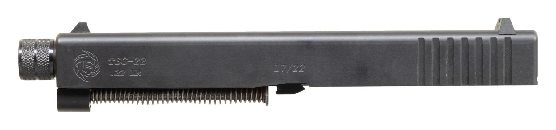 CONVERSION UNIT. Glock 17/22 compatible TSG-22 .22 LR conversion unit mfg. by Tactical Solutions. Left side of the slide is marked with Tactical Solutions logo, followed by "TSG-22/ .22 LR" and "17/22", with Tactical Solutions mfg. information marked on the right. Slide and threaded bbl. exhibit a matte black finish. Fixed white dot front sight with dovetailed square notch rear sight. CONDITION: very good to excellent, with the slide retaining virtually all of its original factory matte black finish, save for a few small superficial handling marks overall. Sides of bbl. exhibit a thin line of wear from cycling of the action. Brilliant mirror bore, retaining well defined rifling throughout. (02-25519/MLW). NON-GUN. $200-300.