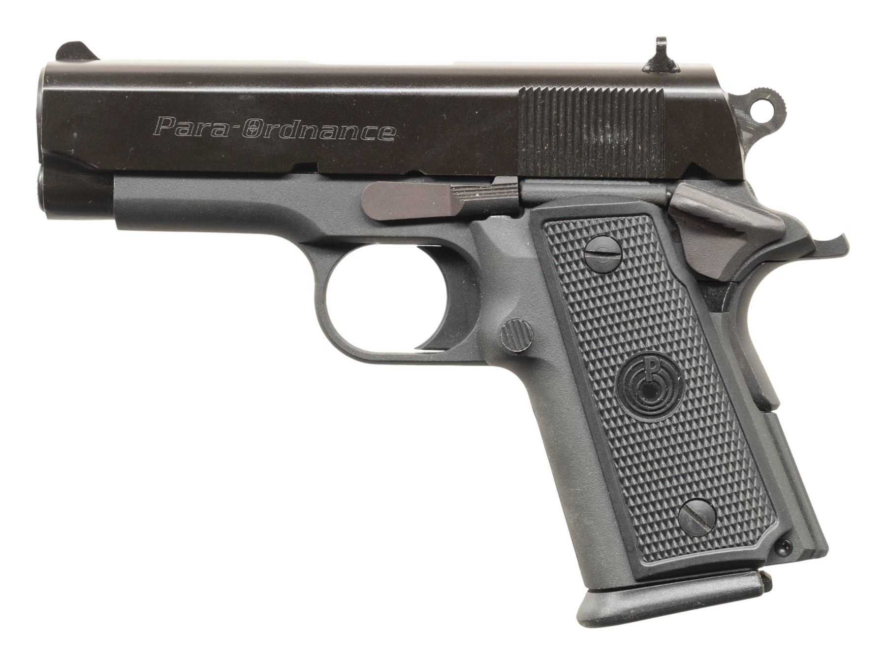 Cal. 45 ACP. S# RJ3379. Bbl. 3 1/2". Three dot sights. Canadian made double stack 1911 style pistol. Slide has matte black finish. Frame has matte gray finish. Checkered black rubber grips with Para logo. MAGS: 2-12 rd. UNATTACHED ACCESSORIES: matching numbered factory hardcase with two bushing wrenches. CONDITION grips show light wear. Left side of slide shows a light scratch above slide stop, metal otherwise shows scattered light handling marks. Action functions properly when hand cycled. Near excellent bore. (25-6554/MJC). MODERN. $400-600.
