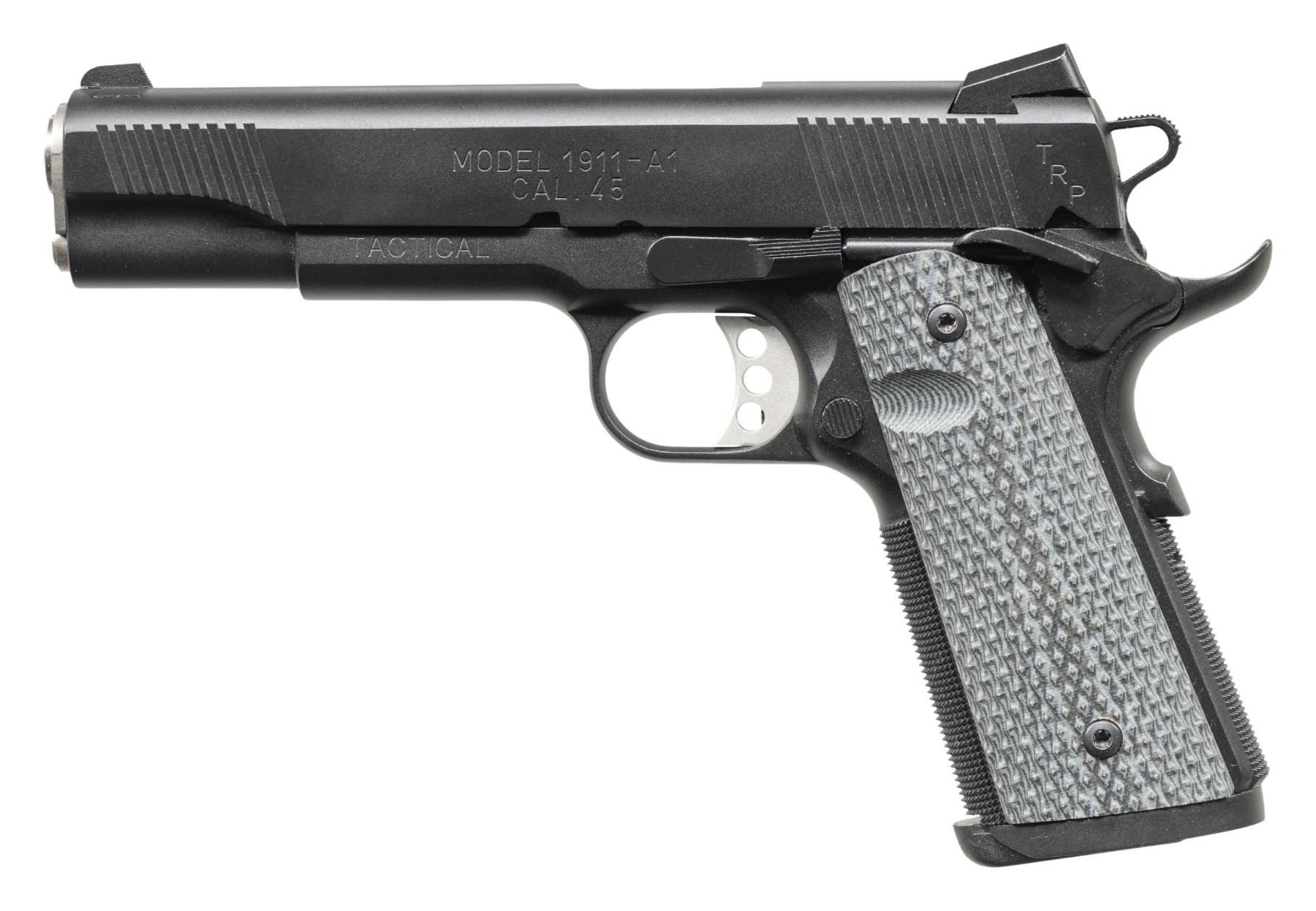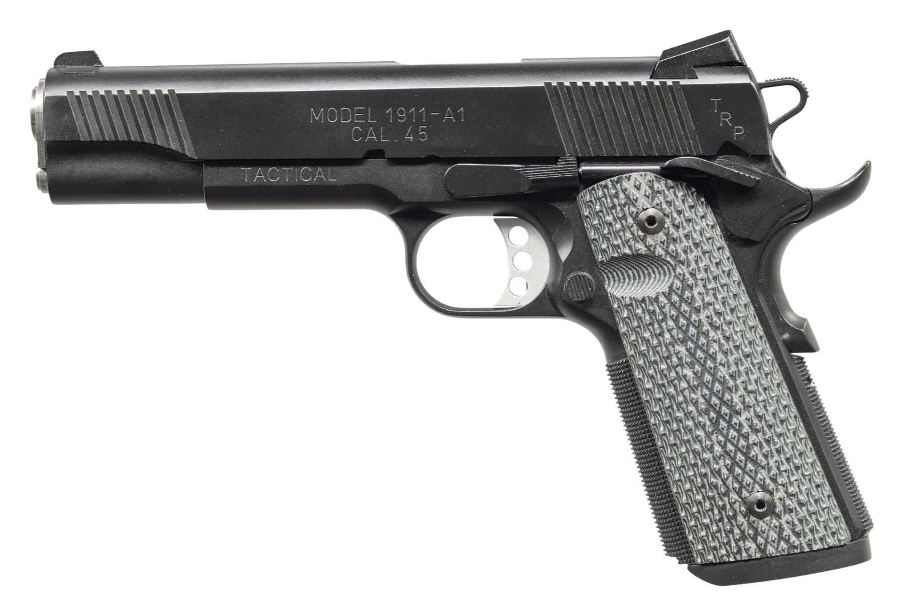 PISTOLS. Both configured as follows: Cal. 45 ACP. Bbl. 5". Three-dot Trijicon night sights. Front & rear slide serrations. Ambi safeties. Extended beavertail grip safeties. Stippled grip straps. G10 grips. Enlarged mag wells.