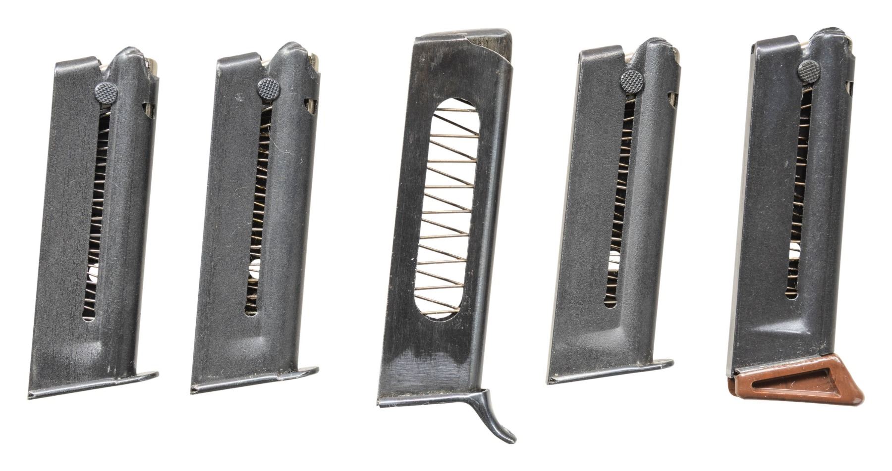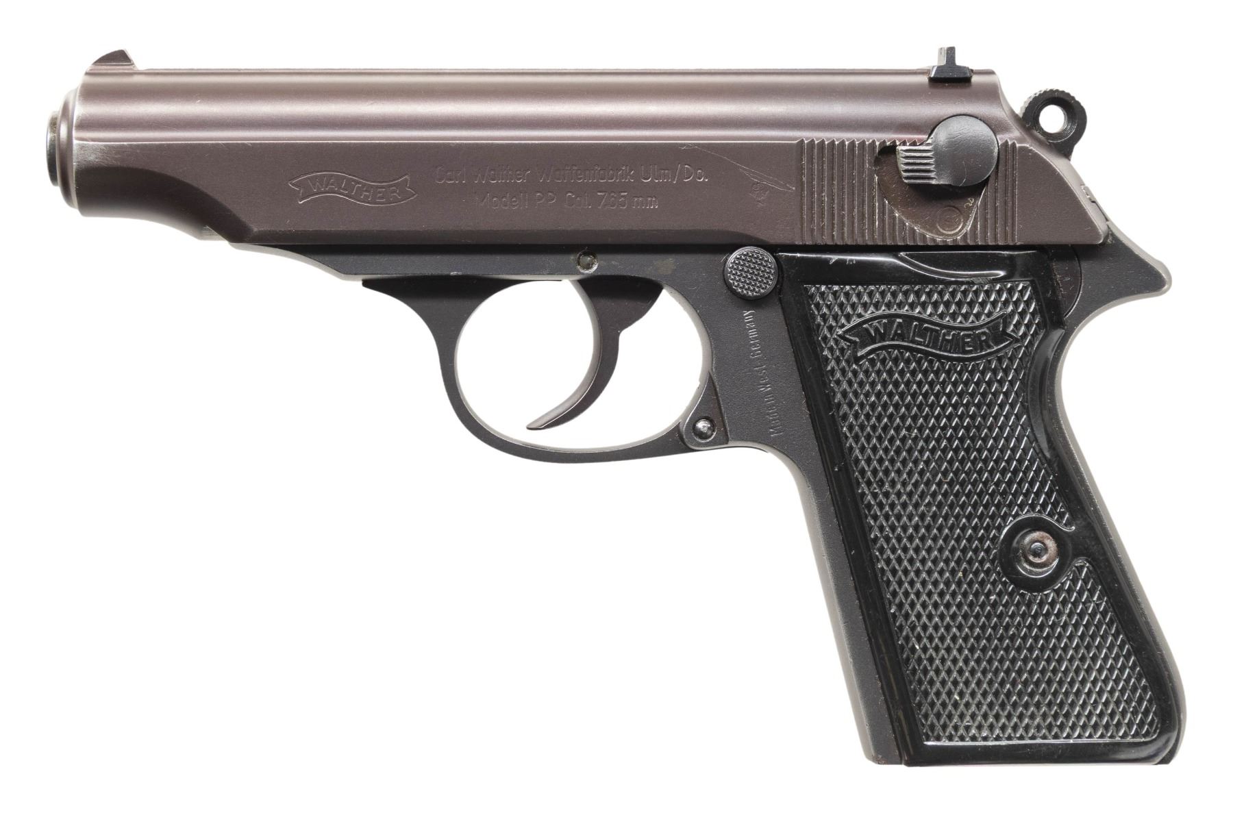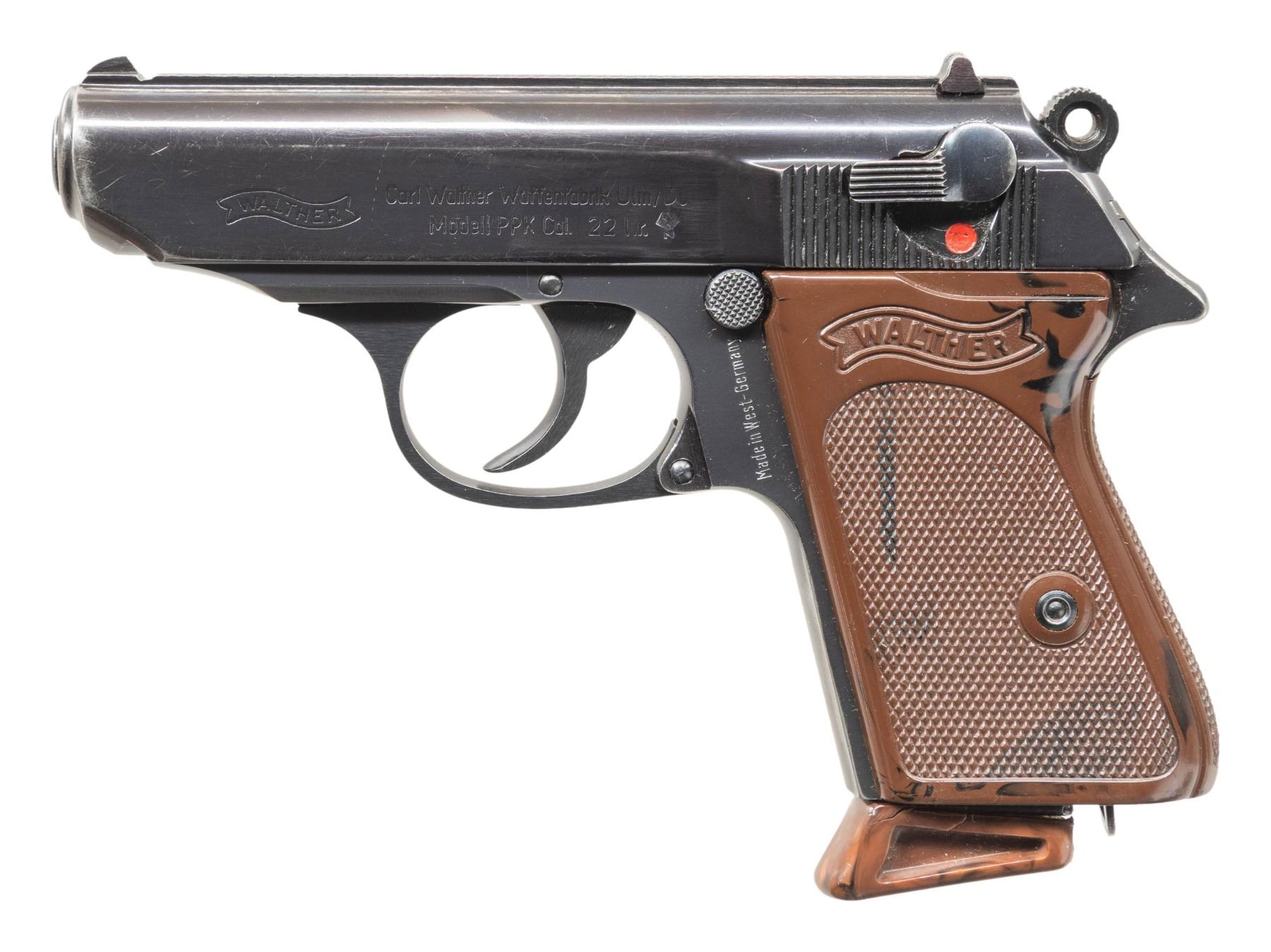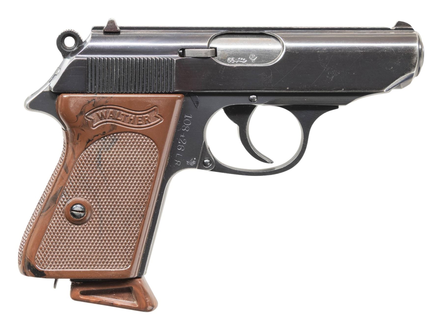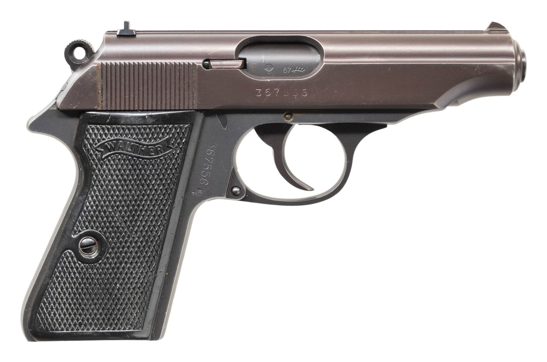 SEMI-AUTOMATIC PISTOLS. 1) WALTHER MODEL PP SEMI-AUTOMATIC PISTOL. Cal. 7.65mm. S# 367556. Bbl. 3 13/16". Model PP semi-automatic pistol mfg. in West Germany by Walther in 1967. Left side of the slide is marked with the Walther banner logo, followed by standard markings denoting Walther's mfg. information, as well as the model and cal. designations. Left side of the frame is marked "Made in West-Germany", with a triad of proofs consisting of a German Eagle/N commercial nitro proof, "67" date code, and an Ulm Proof House antler marked on the right side of the frame at the chamber. Metal components exhibit a dull reapplied blue finish overall. Frame is mounted with 2-piece Walther banner checkered black synthetic grips. Slide features a grooved matte rib with an integral blade front sight and dovetailed U-notch rear sight. Matching numbers are present on the frame and slide. Mag. is absent. CONDITION: metal components retain the majority of their reapplied blue finish, exhibiting light to mild edge wear and some superficial handling marks overall. Mirror bore, exhibiting a couple of small spots of light to mild pitting, while retaining strong rifling throughout. Proper manual mechanics, to include the safety / decocking lever. Grips show general wear and scattered marks from handling and storage, with the right panel exhibiting 2 cracks at the top of the panel. (25-5397/MLW). 2) WALTHER MODEL PPK .22 LR SEMI-AUTOMATIC PISTOL WITH MATCHING FACTORY BOX & SPARE MAGAZINES. Cal. 22 LR. S# 108426LR. Bbl. 3 1/4". Model PPK semi-automatic pistol chambered in .22 LR mfg. in West Germany by Walther in 1966. Left side of the slide is marked with the Walther banner logo, followed by standard markings denoting Walther's mfg. information, as well as the model and cal. designations. Right side of the frame (on chamber area) is marked with a "66" date code, Ulm Proof House antler, and a German Eagle/N commercial nitro proof (Eagle/N repeated on left side of slide and on right side of frame by S#). Metal components exhibit a polished blue finish overall, save for on the chamber area of the frame, which is polished in-the-white. Frame is mounted with 2-piece Walther banner checkered mottled brown synthetic grips. Slide features a grooved matte rib with an integral blade front sight and dovetailed U-notch rear sight. Slide matches the frame via the full S#, which is faintly inscribed on the interior. MAGS: x5 blued steel 10-rd. mags., x2 with mottled brown synthetic grip extensions. Pistol is also accompanied by x1 Beretta Model 1934 7-rd. mag. UNATTACHED ACCESSORIES: matching factory leatherette wrapped cardboard box containing matching factory paper test target. CONDITION: very good, with metal components retaining the majority of their original factory blue finish, exhibiting some light to mild edge wear and some superficial handling marks overall. Brilliant mirror bore, retaining well defined rifling throughout. Proper manual mechanics, to include the safety / decocking lever. Grips show some superficial handling marks, but otherwise remain very good overall. Grip extension on one mag. shows some cracking along the edges of the floorplate. Box is very good, showing some light wear overall. (25-5456/MLW). BOTH CURIO. $800-1,200.