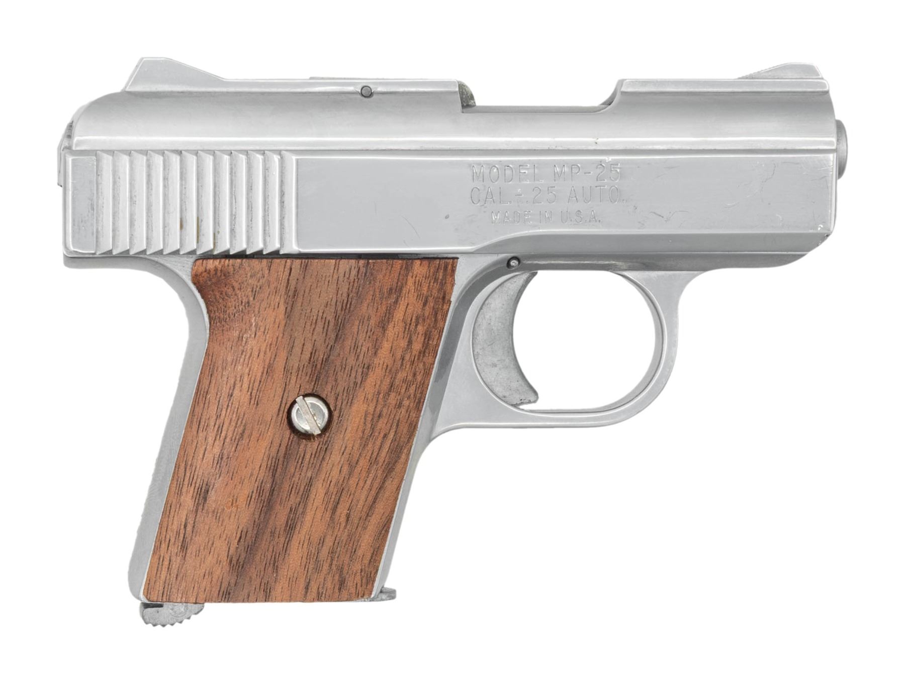 Cal. 25 ACP. S# 819913. Bbl. 2 3/8". Blade front sight. Fixed rear sight. Nickel finish. Smooth hardwood grips. MAGS: 1-6 rd. UNATTACHED ACCESSORIES: matching numbered box with manual. CONDITION: grips & metal show some scattered handling wear & marks with finish loss on left grip panel. Action functions properly when hand cycled. Very good plus bore with strong rifling. (25-6718/MJC). MODERN. $100-200.