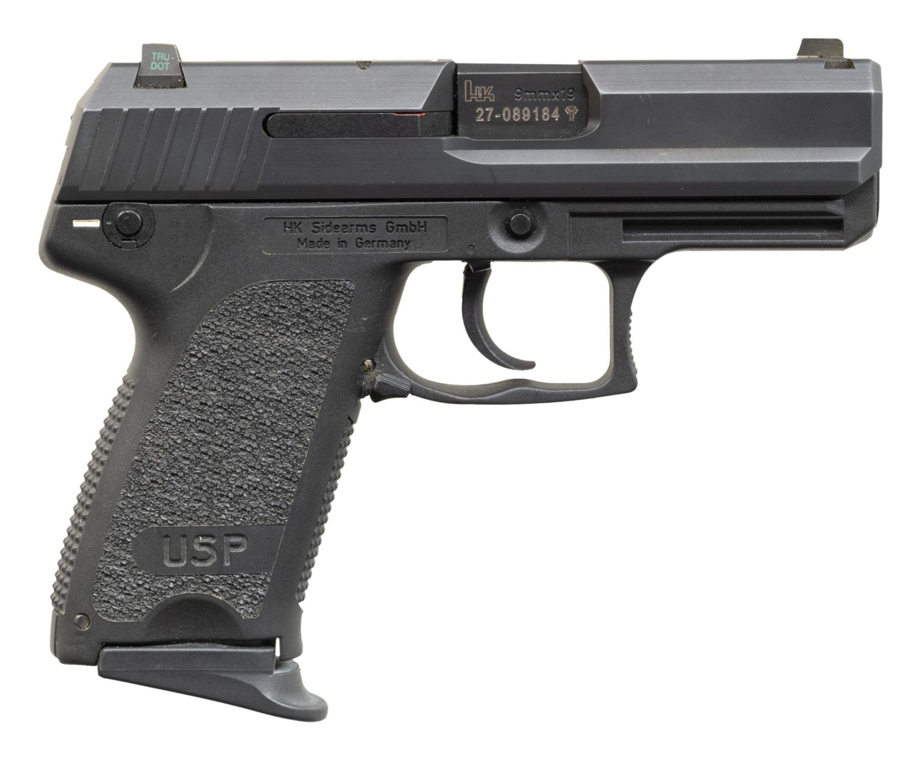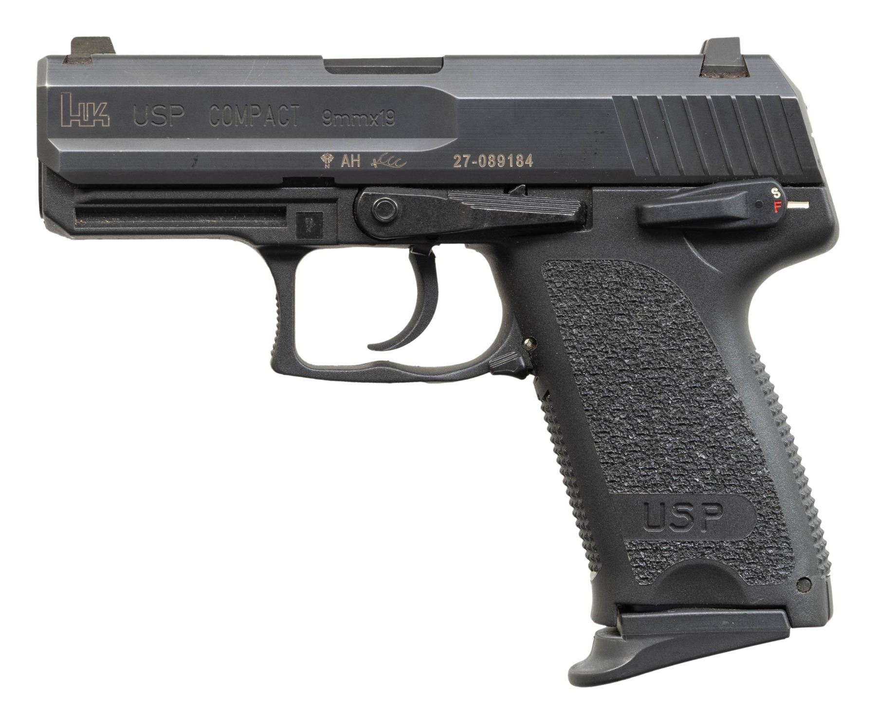 1) H&K USP Compact Semi Auto Pistol. S# 27-089184. Bbl. 3 5/8". Three dot night sights. Right handed manual safety that also acts as a decocker. Bobbed hammer. Matte black finish. Polymer frame with H&K accessory rail. MAGS: 1-13 rd. CONDITION: metal & frame show some edge wear & handling marks. Action functions properly when hand cycled. Bright near excellent bore. (25-4689/MJC).