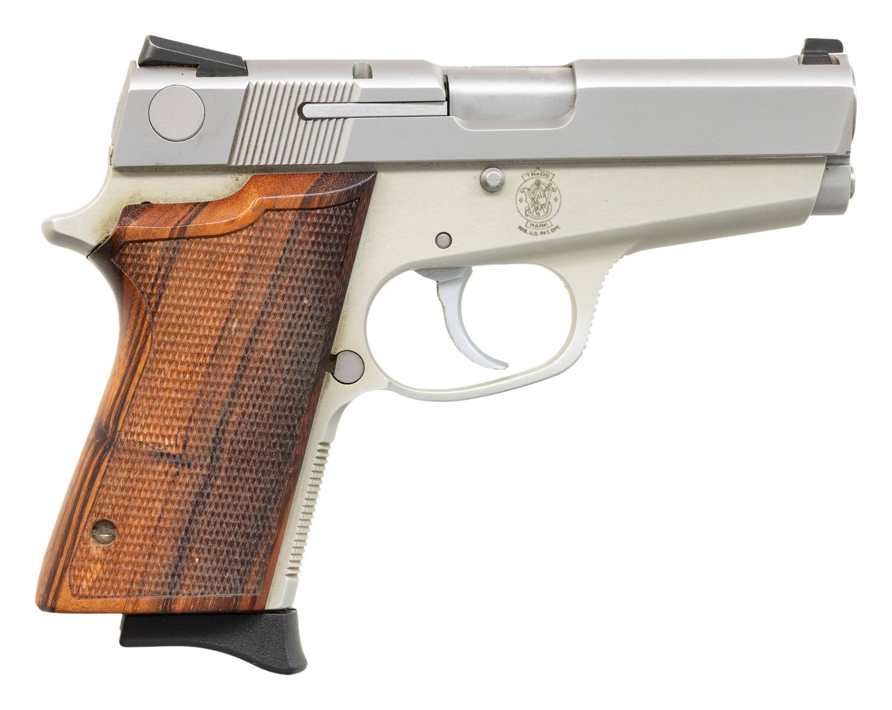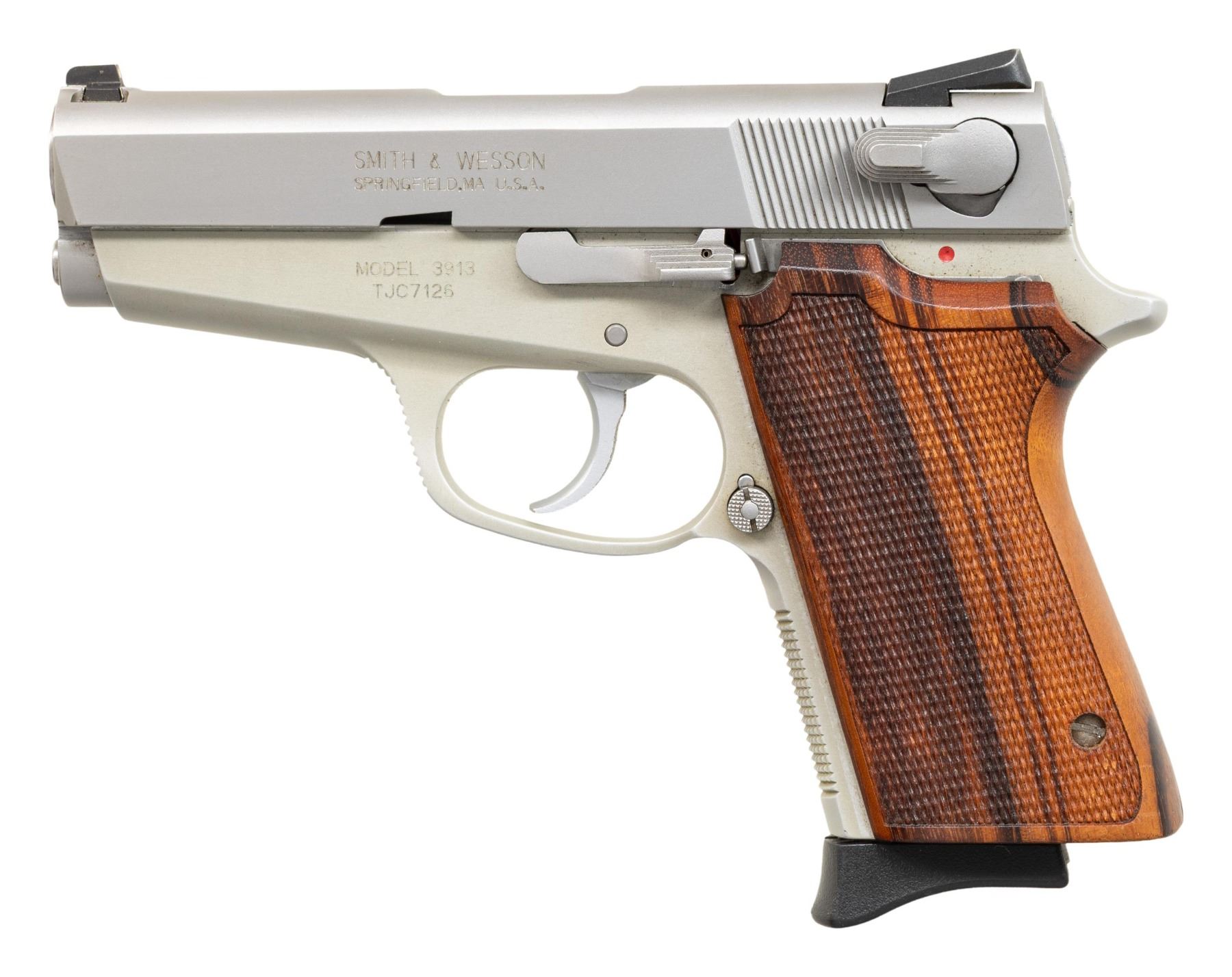 2) Smith & Wesson Model 3913 Semi Auto Pistol S# TJC7126. Bbl. 3 1/2". Three dot sights. Right handed safety that also acts as a decocker. Stainless finish. Unmarked checkered hardwood grips. MAGS: 1-8 rd. CONDITION: grips show light handling wear. Metal shows scattered light handling marks & operational wear. Action functions properly when hand cycled. Bright near excellent bore. (25-4702/MJC). BOTH MODERN. $800-1,300 for lot.