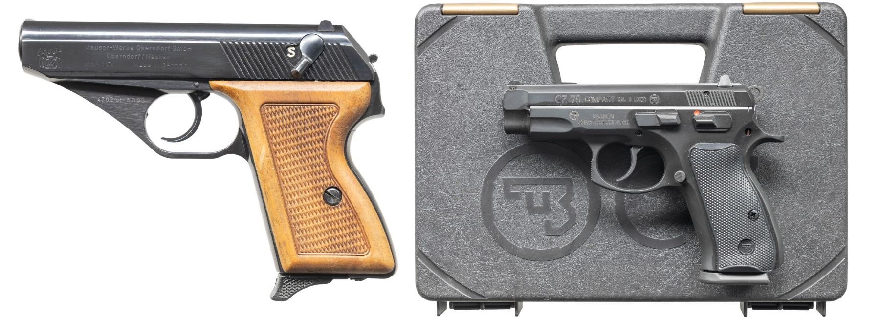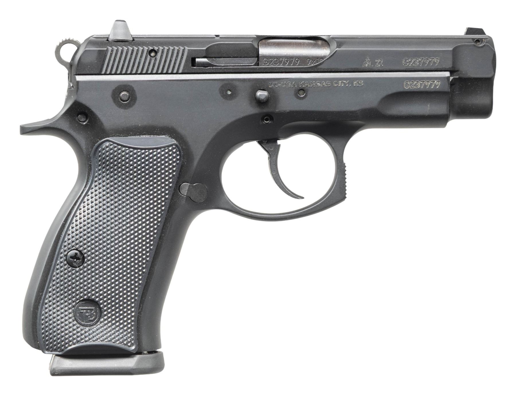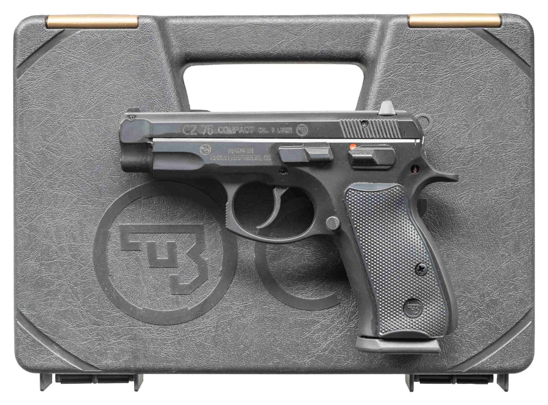 2) CZ-75 Compact Semi Auto Pistol. Cal. 9x19. S# G237979. Bbl. 3 3/4". Three dot sights. Manual safety CZ-75 Compact pistol made in 2022. Matte black finish. Checkered black grips with CZ monograms. MAGS: 3 TOTAL: 2 of 10 rds. & 1 of 15 rds. UNATTACHED ACCESSORIES: matching numbered factory black plastic case with packaging. CONDITION: grips & metal show light handling & usage wear. Action functions properly when hand cycled. Bright near excellent bore. (25-4679/MJC). BOTH MODERN. $600-1,000 for pair.
