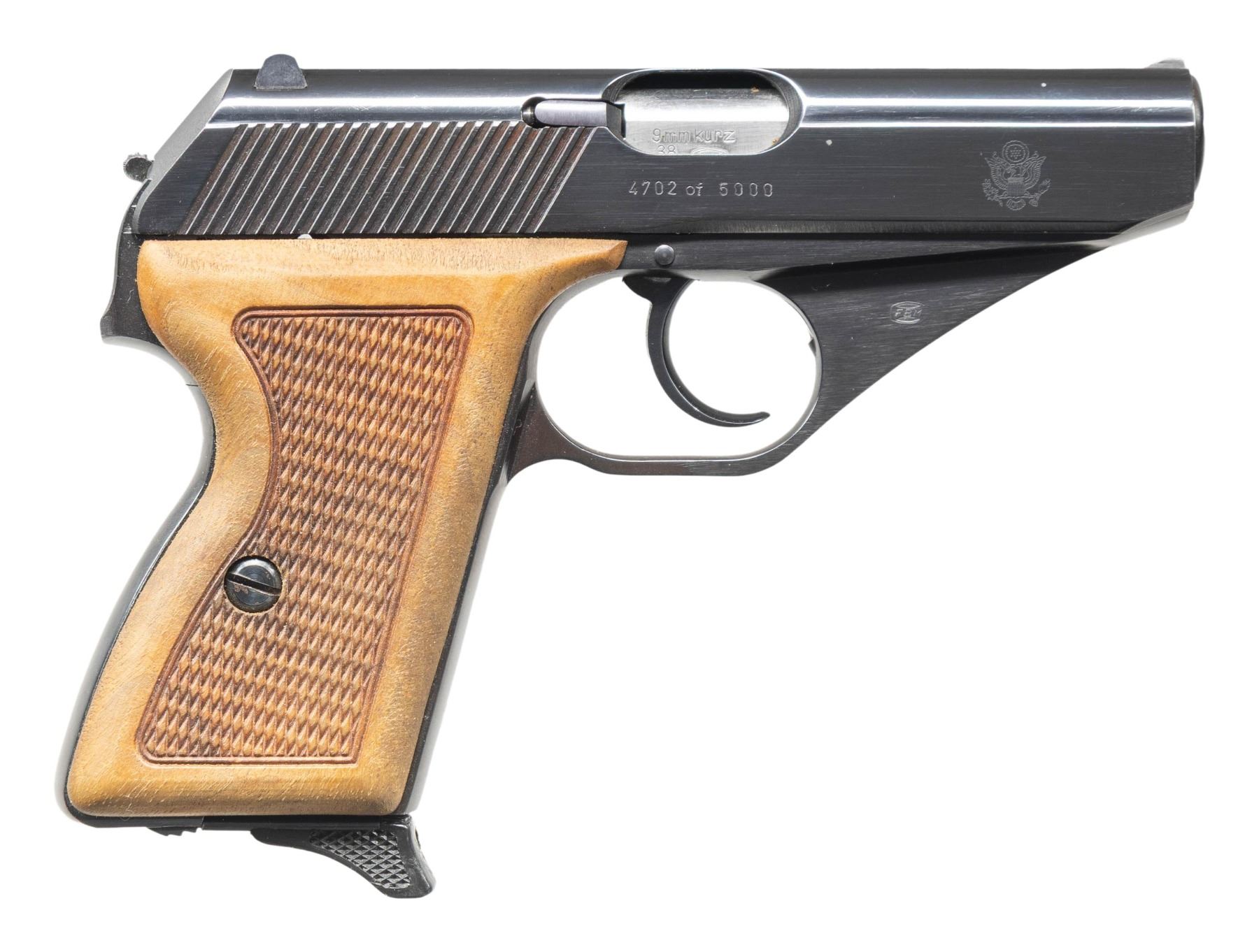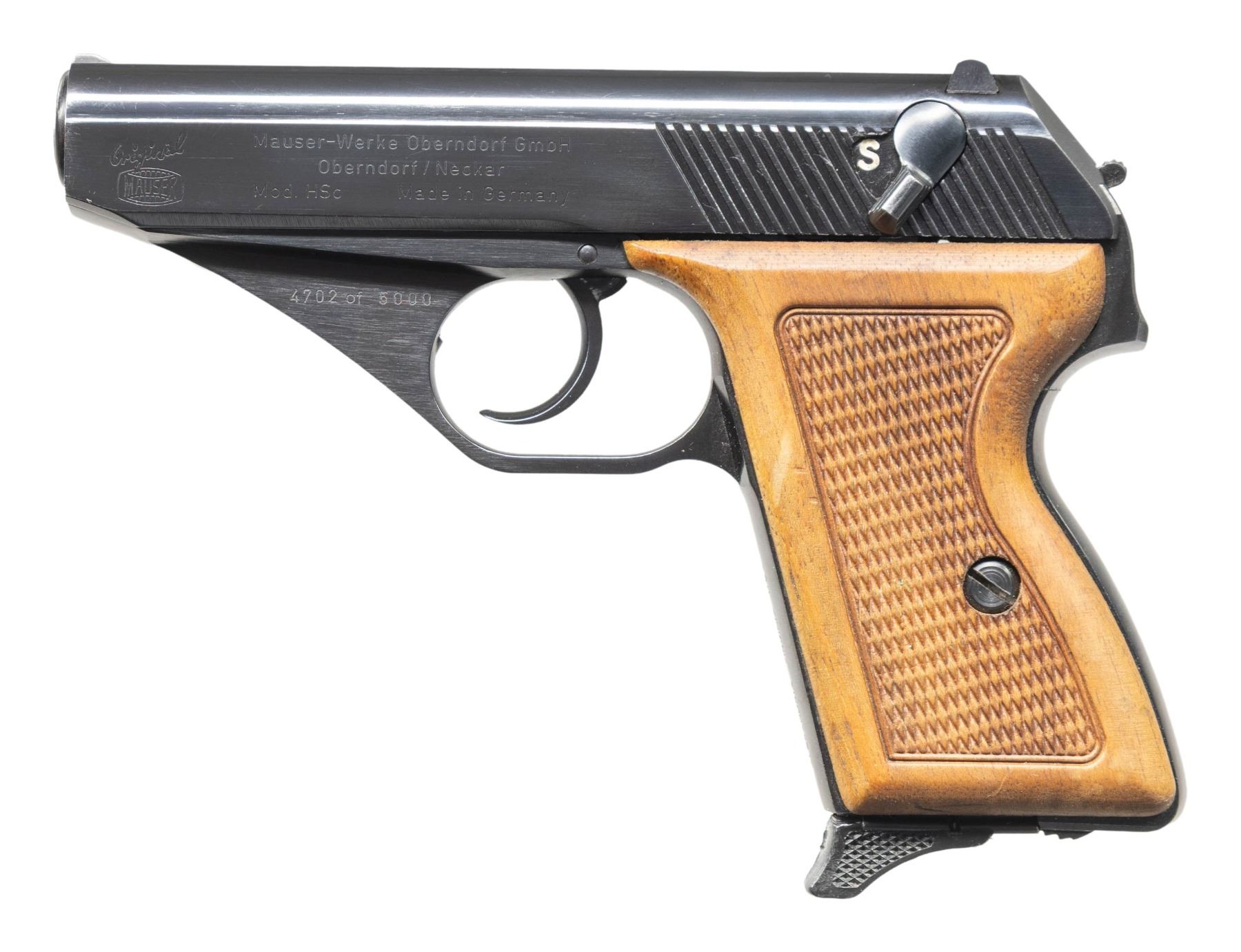 1) Commemorative Mauser HSC Semi Auto Pistol. Cal. 9mm Kurz (380 ACP. S# 4702. Bbl. 3 1/4". Standard HSC sights. Number 4702 out of 5000 Commemorative HSC pistols. Slide has US Eagle seal. Blued finish. Checkered walnut grips. MAGS: 1-8 rd. CONDITION: grips show some light handling marks. Metal retains 98% original blue with some light handling & edge wear. Action functions properly when hand cycled. Bright near excellent bore. (25-4674/MJC).