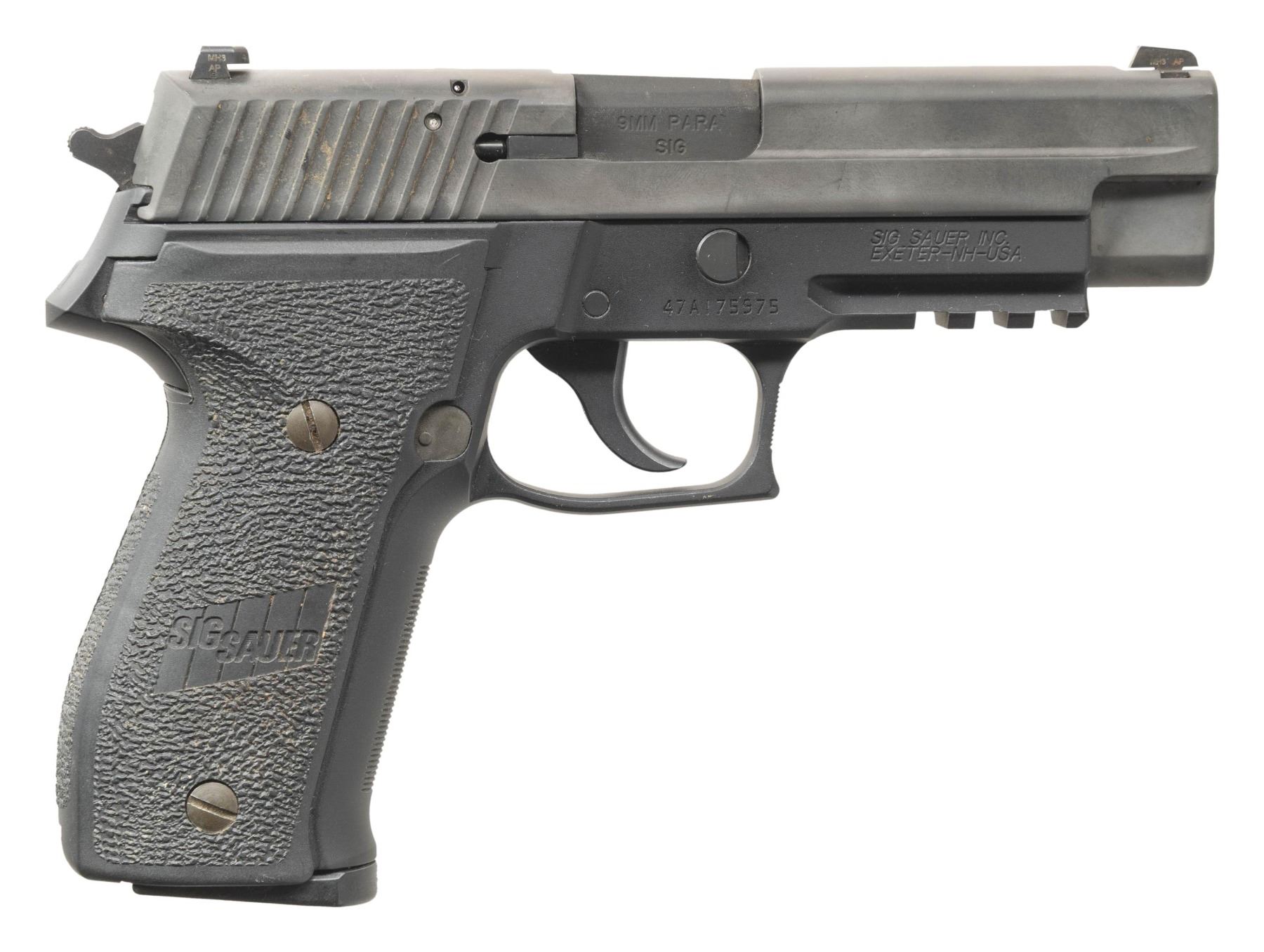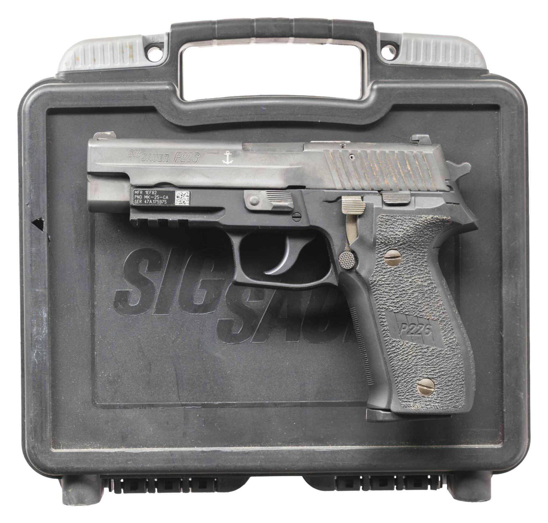 1) Sig MK25 P226 Semi Auto Pistol. S# 47A175975. Bbl. 4 3/8". Three dot night sights. Civilian version of the former Navy SEAL issued pistol. Matte gray slide. Matte black frame with accessory rail. Black rubber grips with Sig Sauer logos. MAGS: 1-10 rd. Mec-Gar. UNATTACHED ACCESSORIES: matching numbered factory hardcase. CONDITION: grips show some dirt staining & handling marks. Metal shows some staining, light oxidation, handling marks & edge wear. Action functions properly when hand cycled. Bright near excellent bore. (25-5385/MJC).