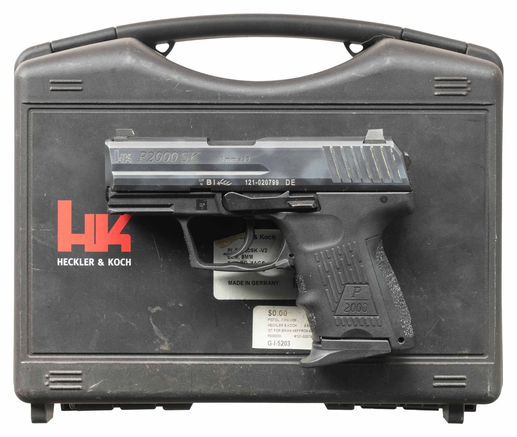 2) H&K P2000SK Semi Auto Pistol. S# 121-020799. Bbl. 3 1/4". Tru-Dot night sights. Matte black finish. Polymer frame with accessory rail. MAGS: 3-10 rd. UNATTACHED ACCESSORIES: factory hardcase with spare grip strap. CONDITION: metal & frame show scattered edge wear & handling marks. Action functions properly when hand cycled. Very good bore. (25-5394/MJC). BOTH MODERN. $800-1,200 for lot.